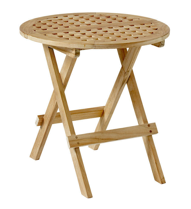 Kreta är ett praktiskt och hopfällbart sidobord i teak. Snygg konstruktion med rutmönster på toppen. Bordet är 50 cm runt.