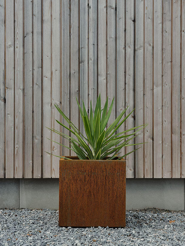 Kummin kruka finns i fyra olika storlekar. Samtliga är gjorda i 2 mm cortenstål, är enkla att montera och har både dräneringshål i botten och ställbara fötter. Kan kompletteras med hjul för enklare förflyttning. Den här modellen är 50x50 cm.