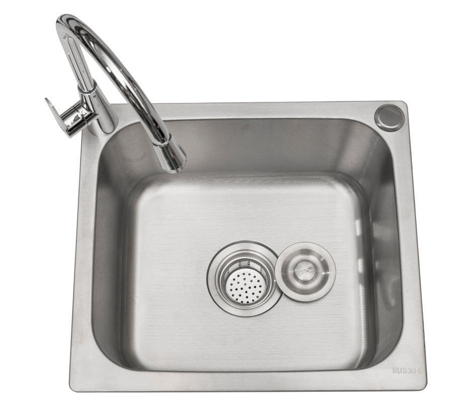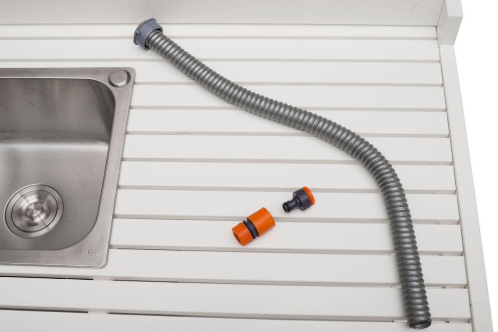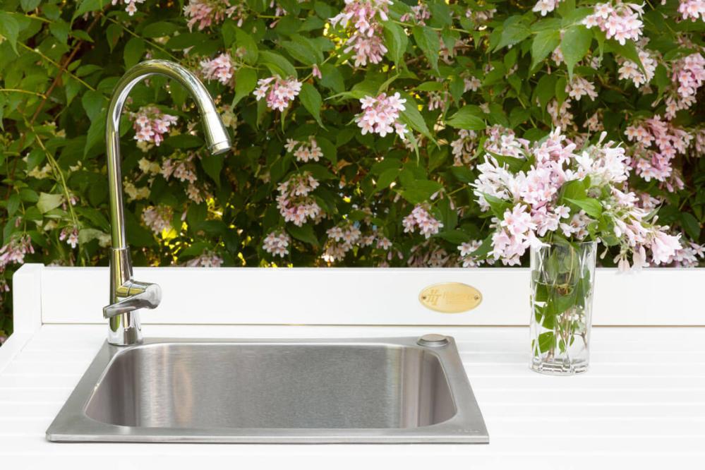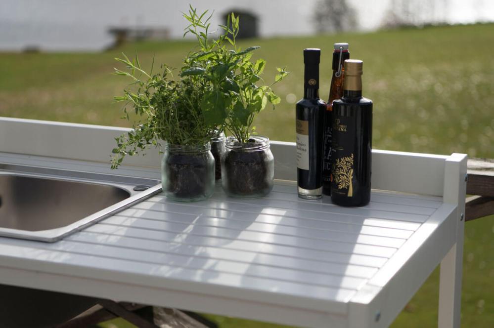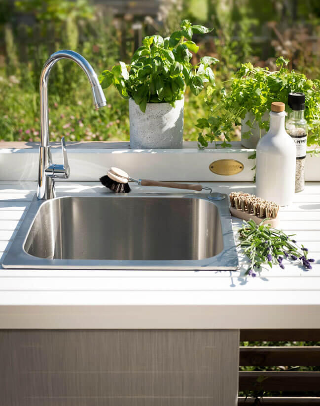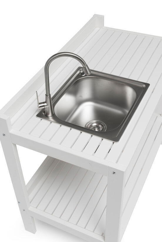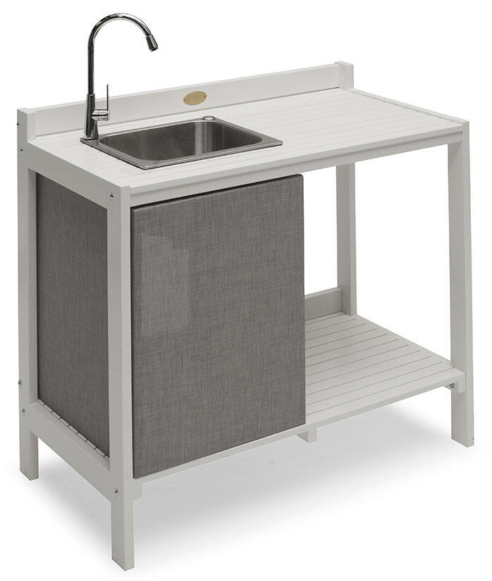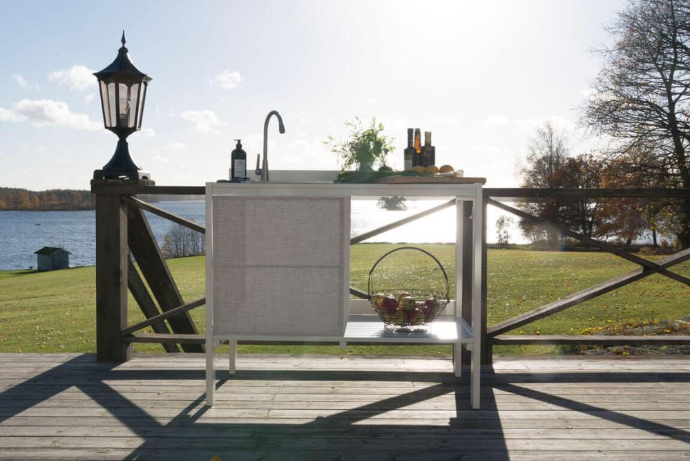 - Utekök med vask, kran i rostfritt stål och textileneskydd för att dölja undersidan av vasken