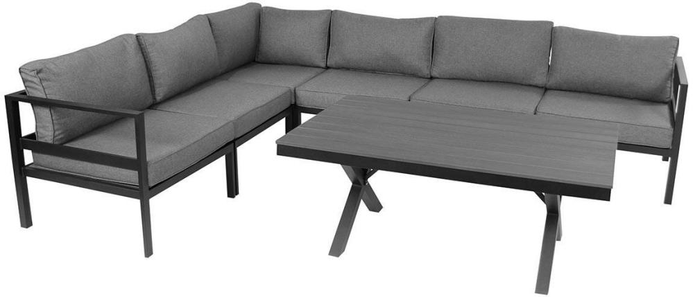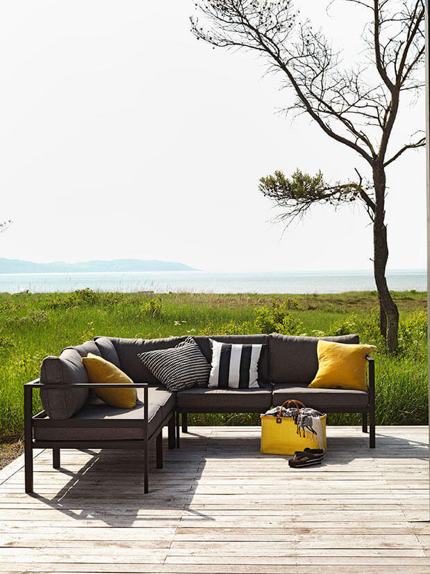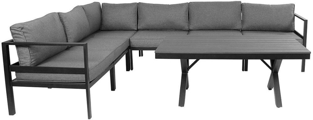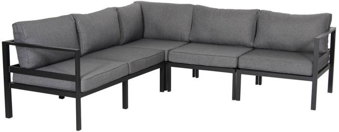 Den byggbara loungesoffan Leone är här sammansatt till en 2-hörn-2 hörnsoffa med gott om plats för skönt häng under varma sommardagar. Leone är en elegant och bekväm soffa tillverkad av mattsvart eller mattvit pulverlackad aluminium med tjocka dynor i grått polyestertyg.
