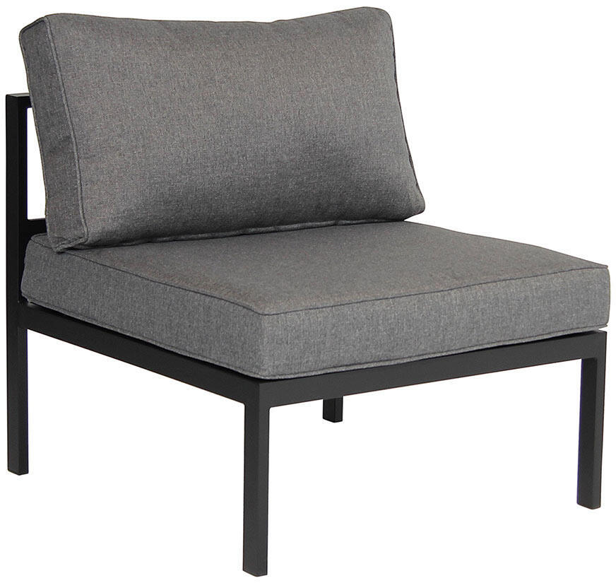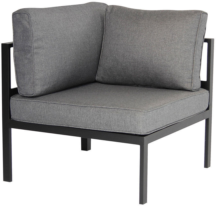 Den byggbara loungesoffan Leone är här sammansatt till en 2-hörn-2 hörnsoffa med öppet avslut åt ena hållet vilket bidrar till en inbjudande känsla. Leone är en elegant och bekväm soffa tillverkad av mattsvart eller mattvit pulverlackad aluminium med tjocka dynor i grått polyestertyg.