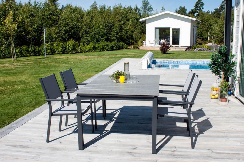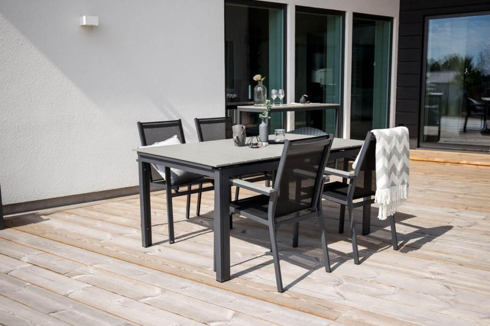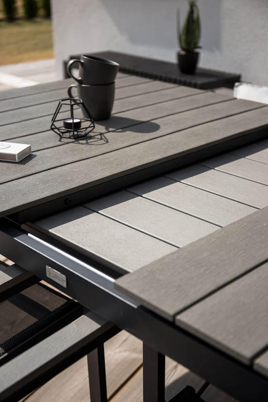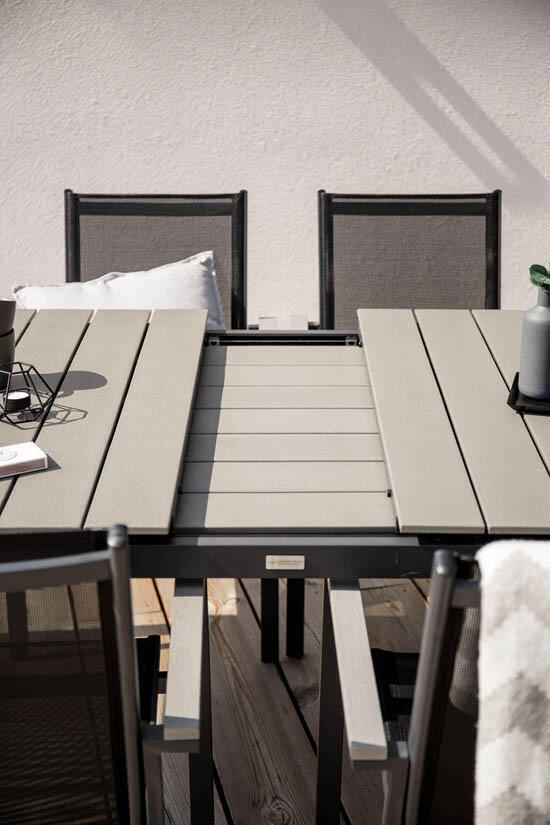 Matbord Levels från Venture Design är tillverkat av svart mattlackad aluminium och aintwood. I bordet ingår en iläggsskiva som gör att du kan förlänga bordet från 160 till 240 cm, skivan kan smidigt förvaras i bordet när den inte används.