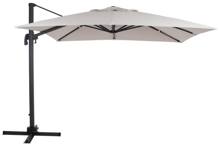Linz är ett frihängande parasoll med måtten 300x300 cm. Parasollduk av 220 gram UV-beständig polyester med aluminiumstativ. Parasollet justeras med vev och steglöst reglage/tilt. Fotkors ingår och bör förankras med 4 stycken parasollfotsvikter eller skruvas fast i altanen, vikter köps separat.