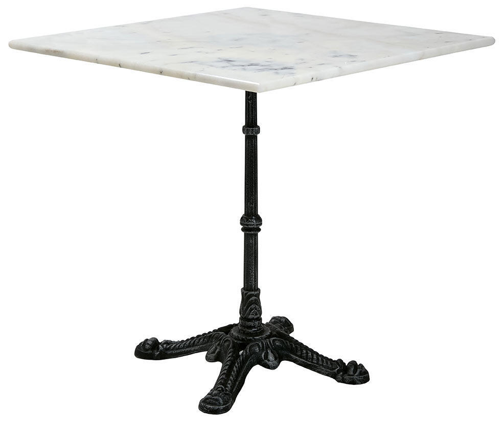 Loire är ett stilrent 70x70 cm marmorbord som passar perfekt på balkongen eller som frukostbord på altanen. Toppskivan är vit (ljusgrå) med gråsvart gjutjärnsunderrede.