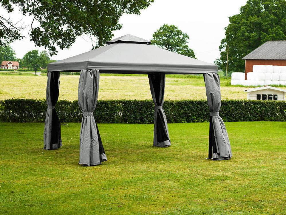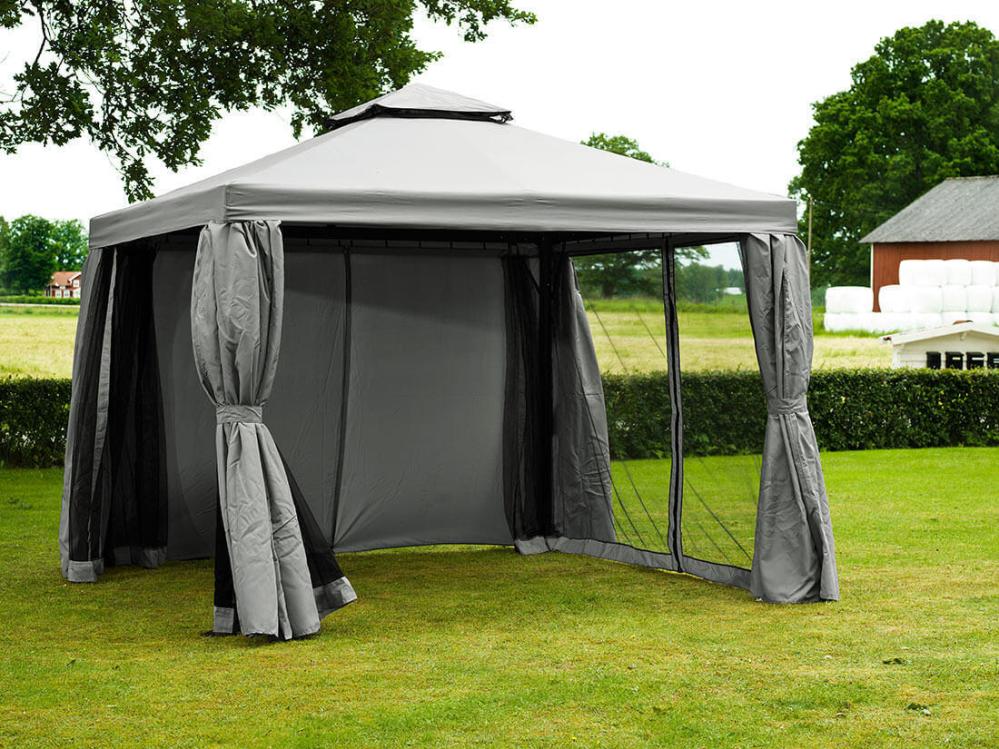 Paviljong Luxor 300x300 cm har mörkgrå metallstomme i aluminium samt tak och väggar i ljusgrå polyester. Paviljongen levereras komplett med tak (300 g), sidoväggar och myggnät. Medföljer gör även metallstag för att förankra paviljongen i gräsmattan.
