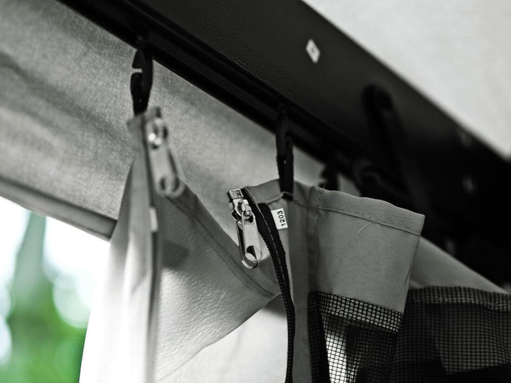 Myggnät och sidoväggar kan användas separat. Det går bra att ha både myggnät och/eller sidovägg på en eller flera sidor av paviljongen medan de andra sidorna kan vara helt öppna. Väggarna sammanfogas med dragkedja mitt på paviljongens sida, samma gäller myggnätet. Myggnäten har en ljusgrå ram med svart nät. För att undvika att vatten blir kvar på taket sitter öljetter/hål ca 10 cm från takfoten där vattnet kan dränera bort.