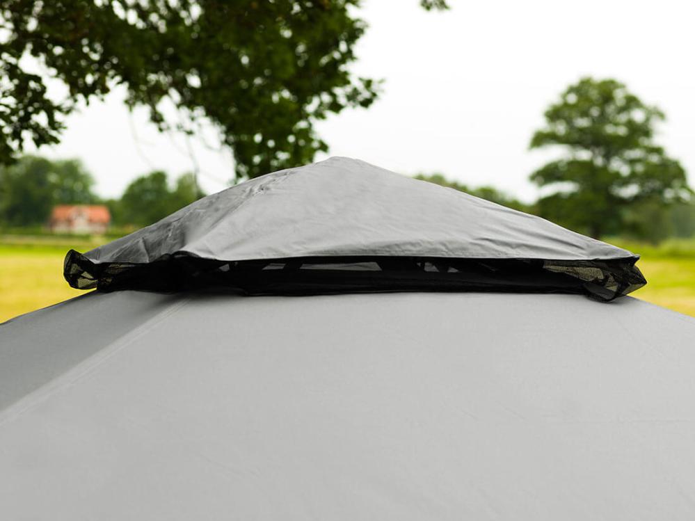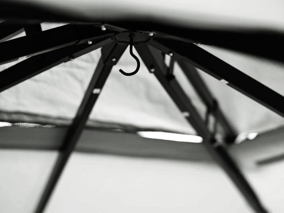 En centrerad krok i mitten av undertaket passar bra att hänga belysning eller annan dekoration i. Övre taksektionen mäter 79x79 cm och ger ventilation i paviljongen och gör att luften passerar enklare.
