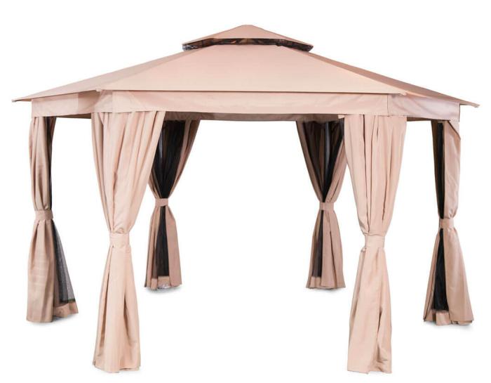 Paviljong Luxor 6-kantig Ø400 cm har mörkbrun metallstomme i aluminium samt tak och väggar i beige polyester. Paviljongen levereras komplett med tak (300 g), sidoväggar och myggnät. Medföljer gör även metallstag för att förankra paviljongen i gräsmattan.