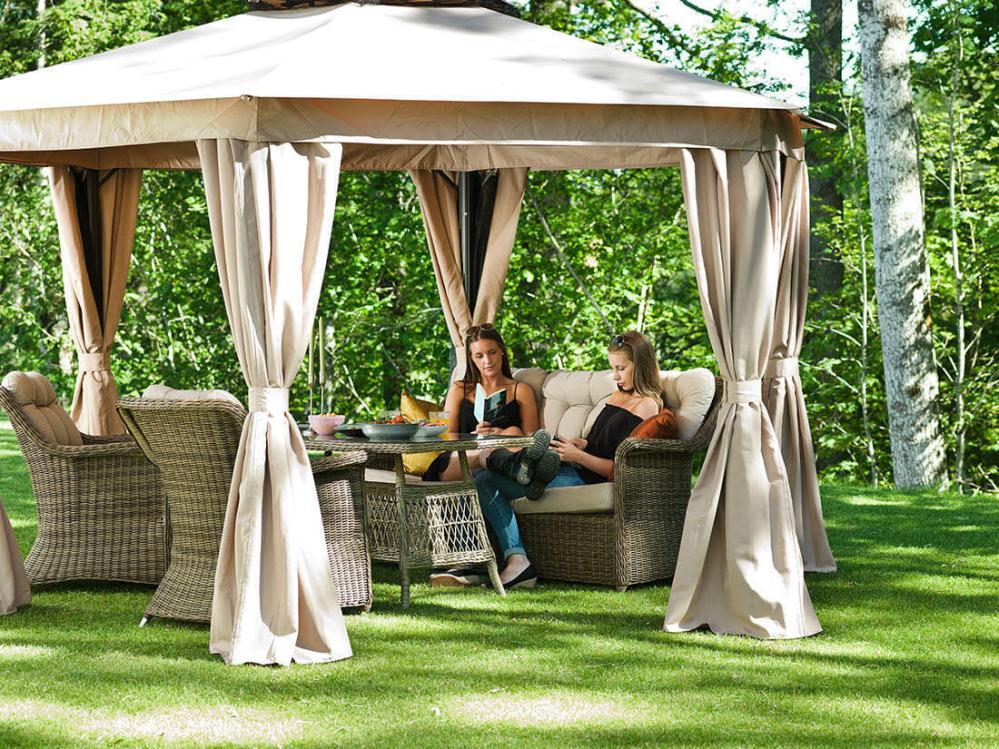 Luxor paviljong finns även i storlek 300x300 och 300x400 cm. Du hittar dem samt separat tak, myggnät och paviljongväggar en bit ner på sidan under Liknande produkter.
