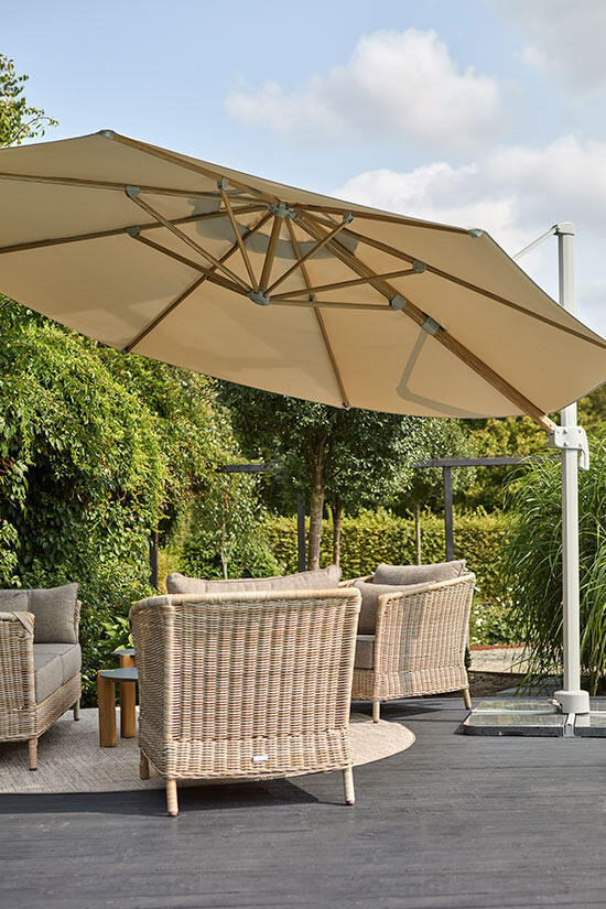 Parasollstativet är gjort av lätt men robust aluminium och utrustat med en praktisk vev för enkel öppning och stängning. Dessutom har Luzzi en steglös kontroll som gör det möjligt att vinkla parasollet framåt och bakåt, för optimal skuggning hela dagen. Observera att parasollet inte går att tilta i sidled.