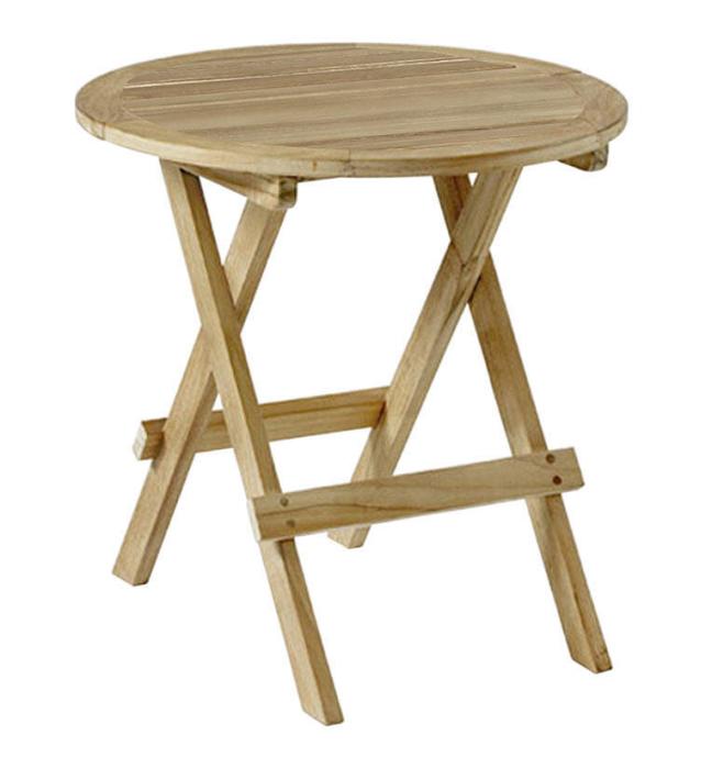 Moni är ett praktiskt och hopfällbart sidobord i teak. Snygg konstruktion med vackra teakribbor på toppskivan. Bordet är 50 cm runt.