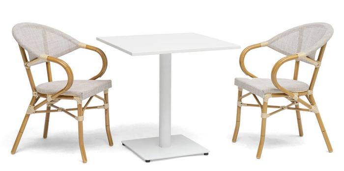 Näsby 70x70 cm cafébord här med två stycken Äppelhed caféstol som tillsammans skapar en mysig cafégrupp.