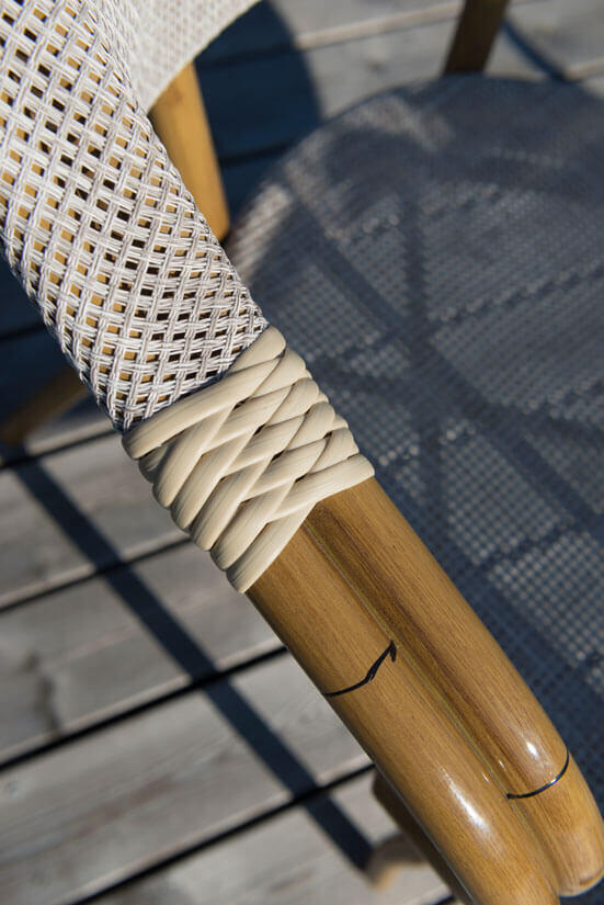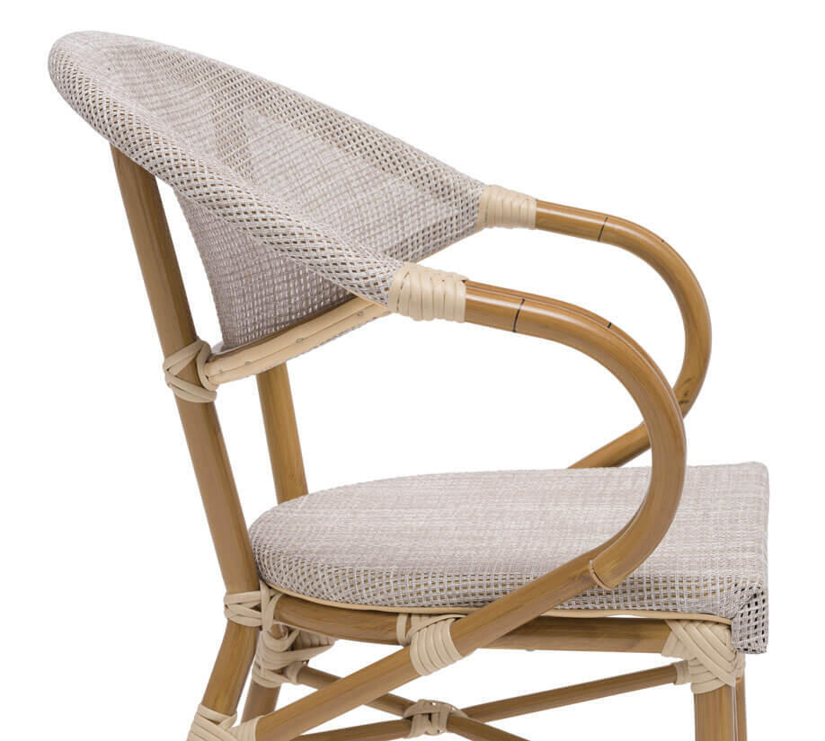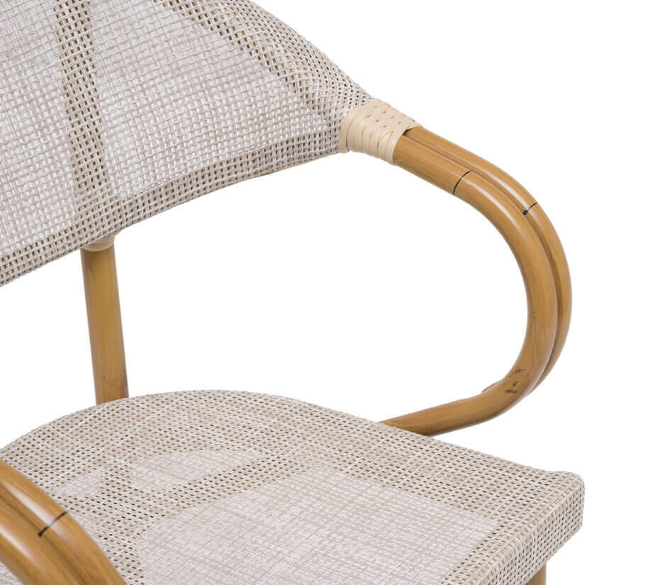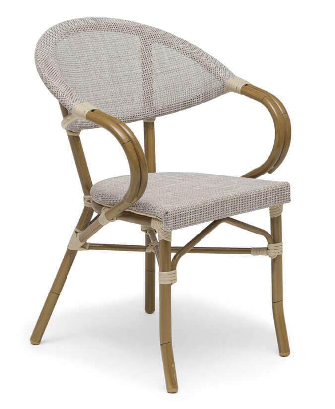 Äppelhed caféstol är en bekväm stol i ljusbrun aluminium med flätad sits och rygg i ljusbeige textilene. Stolen är stapelbar för praktisk förvaring.