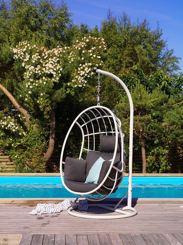 Palo är en härlig rogivande hänggunga i svart eller vit pulverlackerad aluminium med tjocka mjuka dynor och nackkudde i grått olefintyg. Palo hänggunga är perfekt för lata dagar. Godkänd för 130 kg.