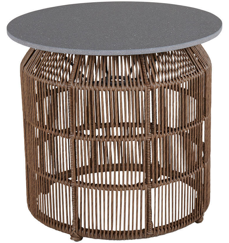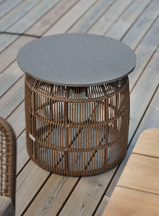 Pamir Ø50 cm sidobord, är ett runt elegant bord i twistad kontrotting. Bordet finns i två färger, här i färg natur med mörkgrå stenskiva. Matchas snyggt tillsammans med lampskärmar från samma produktserie eller andra möbler i twistad konstrotting.