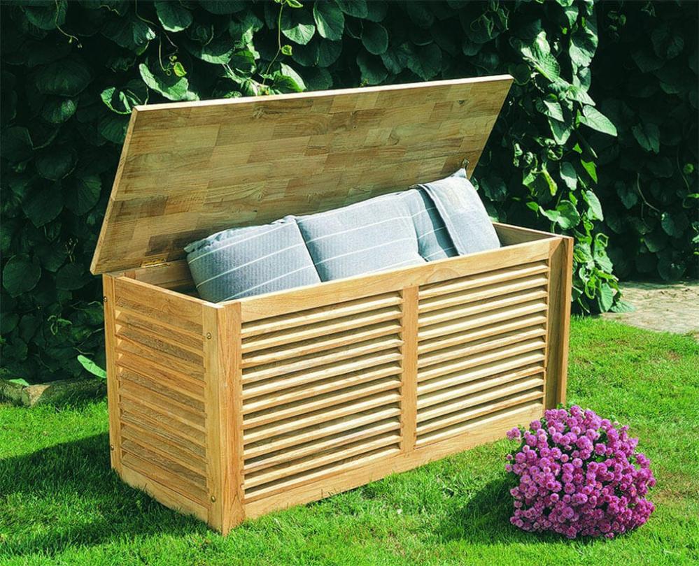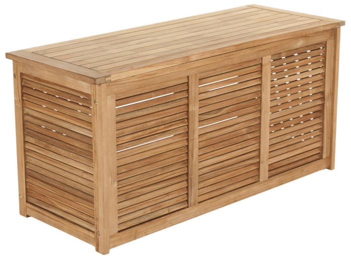 Papaya dynlåda är en praktisk och rymlig förvaringslåda i teak med nåtat lock. Lådan fyller sitt syfte med att förvara dina trädgårdsdynor, kuddar och trädgårdsredskap på uteplatsen. Tack vara lådans lock ger även Papaya en god avställningsyta. Dynboxen är elegant i kvalitativ teak med dekorativa linjer i svart på ovansidan. Teakribborna på sidorna har viss mellanrum vilket ger en god ventilation, men det kan samtidigt göra att fukt tränger sig in.
