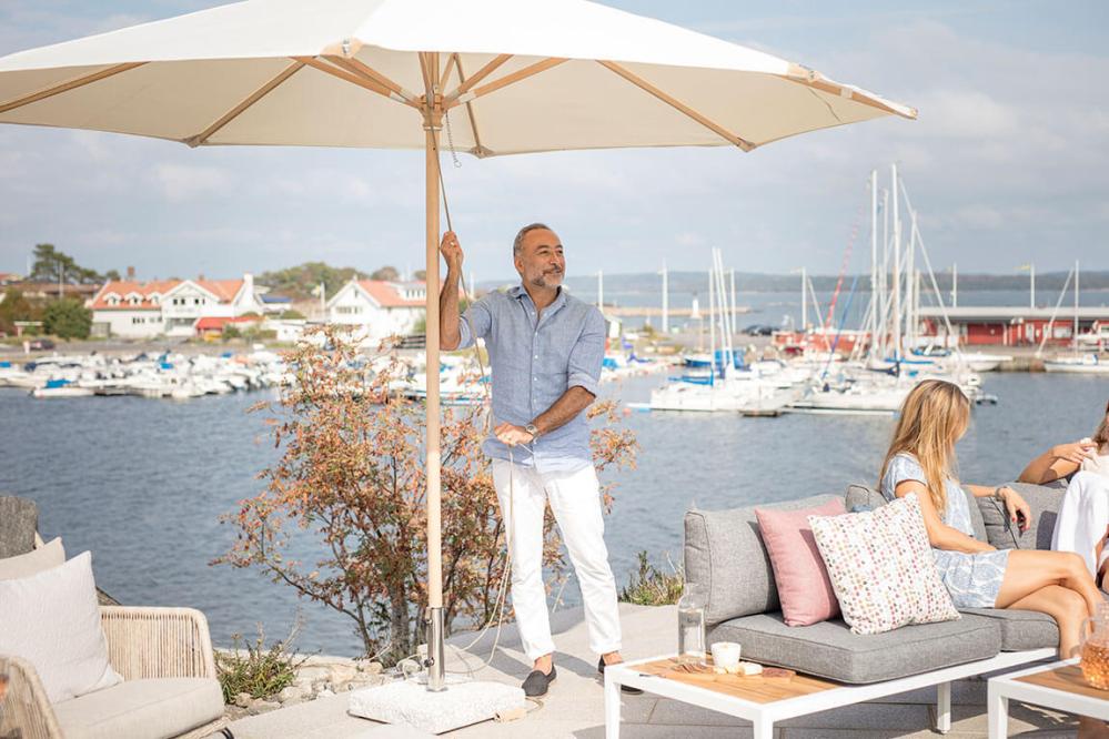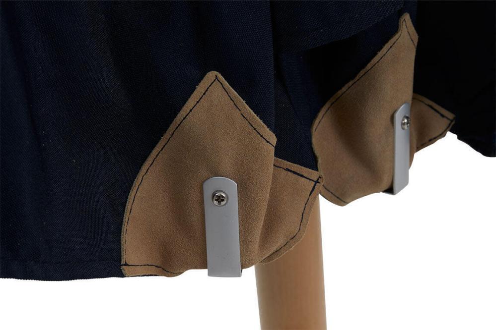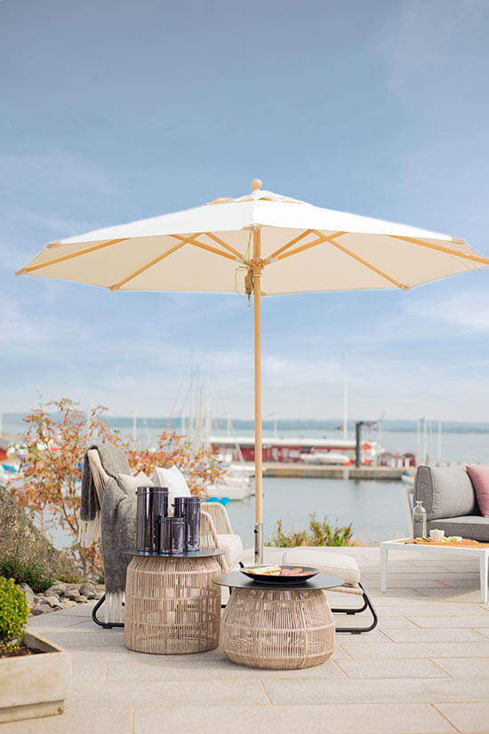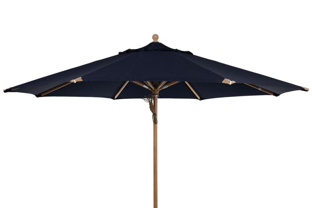 Parma är ett runt träparasoll i storleken Ø350 cm av FSC-märkt trä (sycamore) med mattlackad yta. Parasollet har fina detaljer så som läderskoningar och upphängning för repet. Tak av 250 g polyester i valfri färg matchar den fina trästolpen i naturfärg. Stångens diameter är 48 mm. Parma är inte tiltbart.
