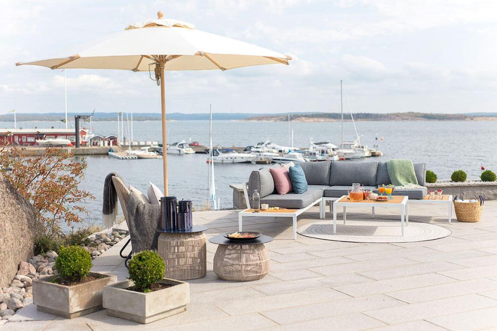 Vi rekommenderar att skydda tyget med parasollskydd för att minimera blekning och förlänga dukens livslängd.