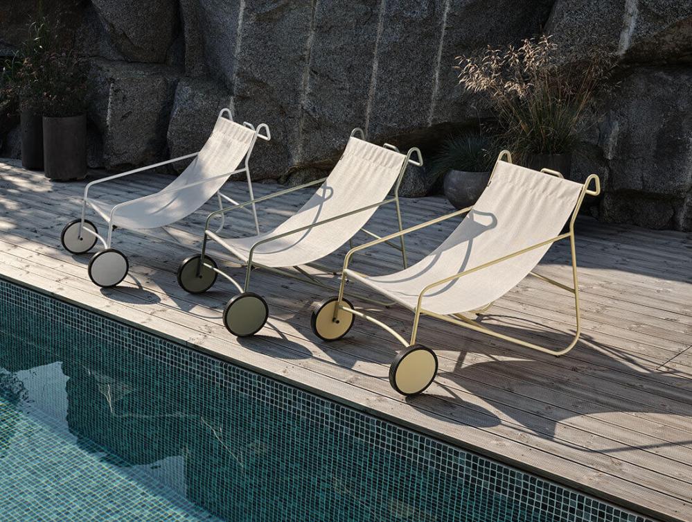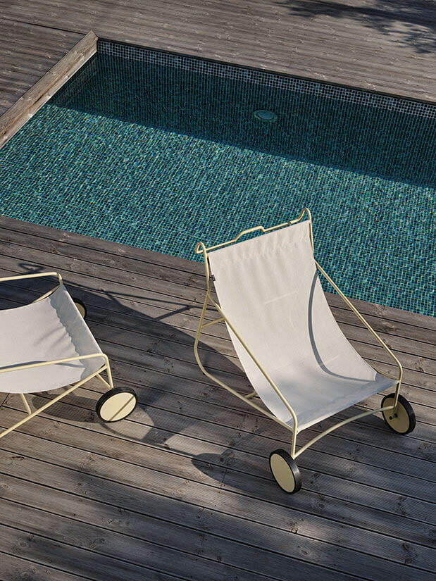Poul Chair är en unik loungefåtölj med glimten i ögat. Rulla din viloplats dit du vill ha den med hjälp av hjulen och den smarta stången baktill – som även dubbeljobbar som krok när du behöver hänga ifrån dig din handduk, skjorta eller solhatt. Behöver du tvätta tygsitsen går den enkelt att ta av tack vare en dragkedja. Tyg i offwhite.