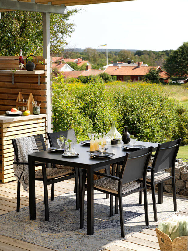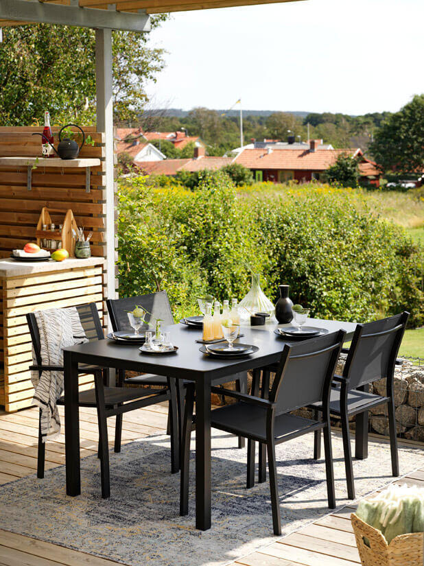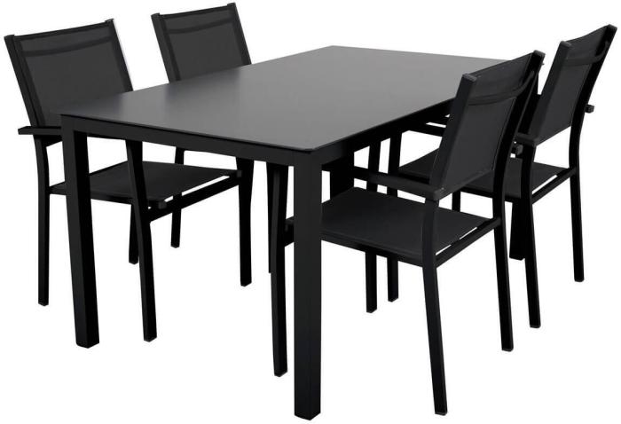 Här har vi satt samman en populär matgrupp till uteplatsen bestående av ett matbord 150x90 cm med fyra stycken karmstolar. Rana matbord och stolar har en stomme av mattlackad aluminium i två färger med fin finish, bordet har en mörk sprutlackerad bordsskiva av härdat glas och stolarna skön textilene i antracitfärg som ger hög sittkomfort. Karmstolarna är stapelbara för smidig förvaring under vinterhalvåret.