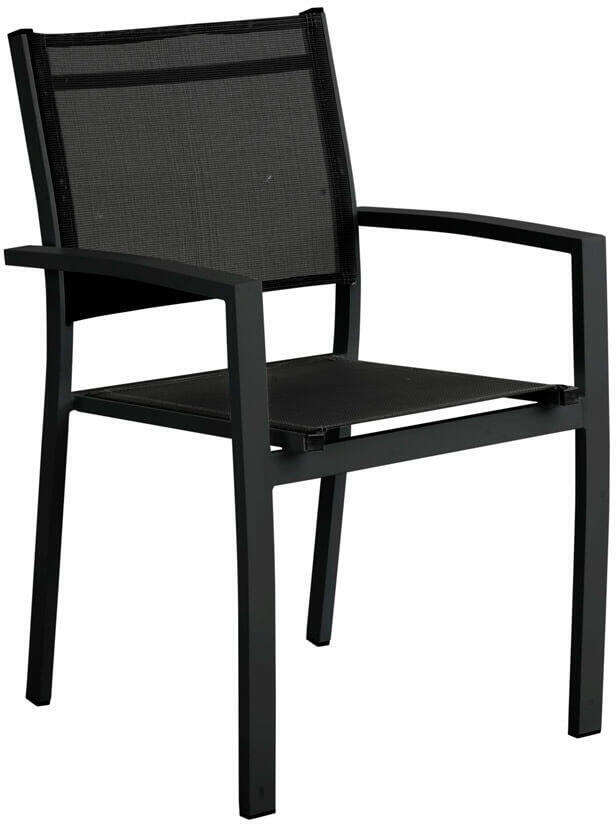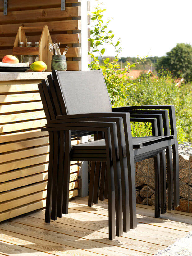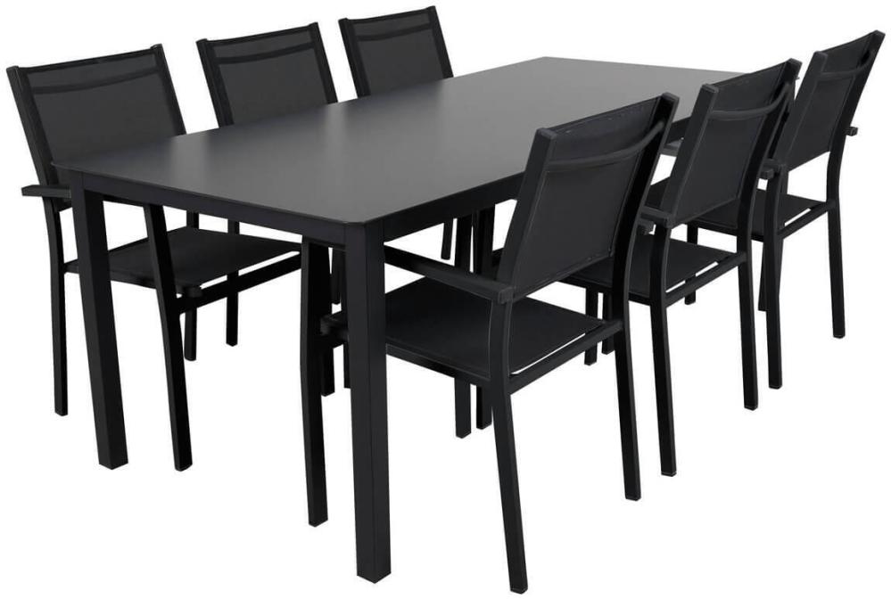 Här har vi satt samman en populär matgrupp till uteplatsen bestående av ett matbord 200x90 cm med sex stycken karmstolar. Rana matbord och stolar har en stomme av mattlackad aluminium i två färger med fin finish, bordet har en mörk sprutlackerad bordsskiva av härdat glas och stolarna skön textilene i antracitfärg som ger hög sittkomfort. Karmstolarna är stapelbara för smidig förvaring under vinterhalvåret.