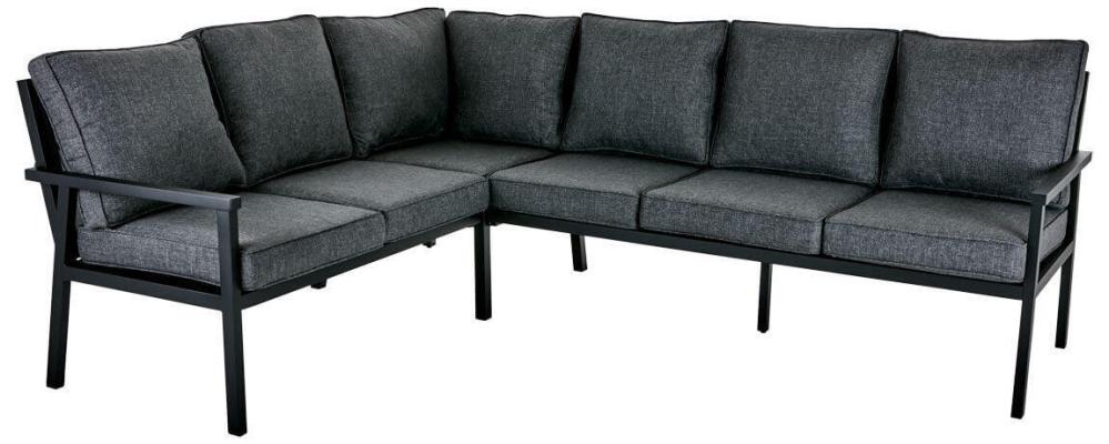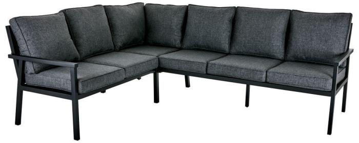 Hörnsoffa Rana i storlek 2-hörn-3 eller 3-hörn-2 med hög sits är en bekväm soffa som bjuder in till många sköna sommarkvällar. Soffgruppen till uterummet eller uteplatsen har en stomme av mattlackad aluminium med fin finish i två färger och mörka dynor i ett slitstarkt olefintyg som ger möblerna hög sittkomfort.