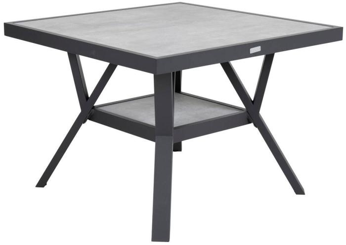 I trädgårdsserien från Samvaro finns två storlekar av soffbord Hög, det här är det mindre bordet med måtten 90x90 cm. Bordet har en aluminiumstomme med en glasskiva med 3D-tryck. För praktisk förvaring har utebordet en underhylla.