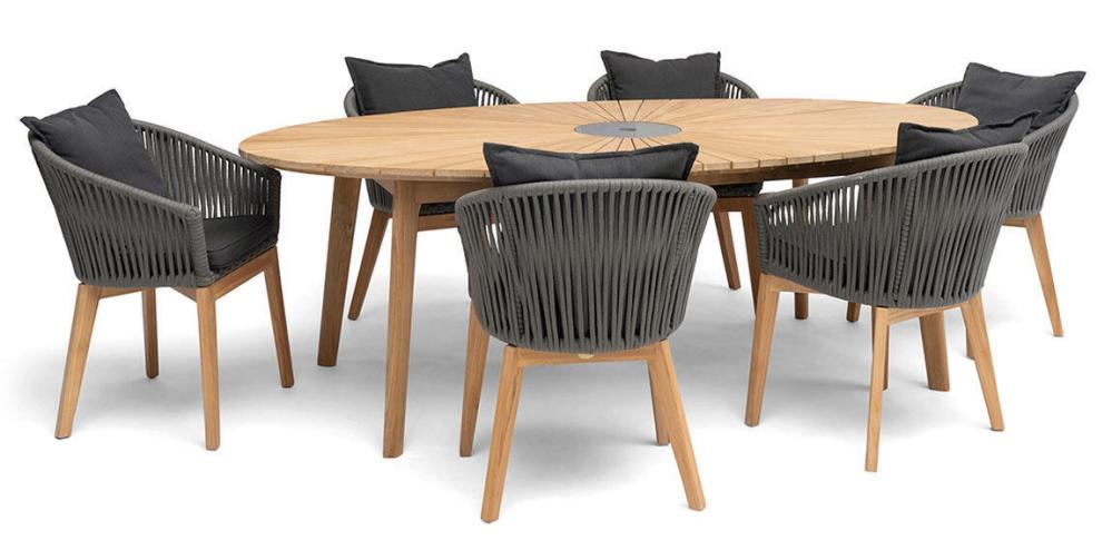 Sandhammaren här som matbord med solfjäderformad bordsskiva med centrerad granitskiva med hål för parasoll. Det rejäla och kvalitativa utebordet mäter hela 220x120 cm.
