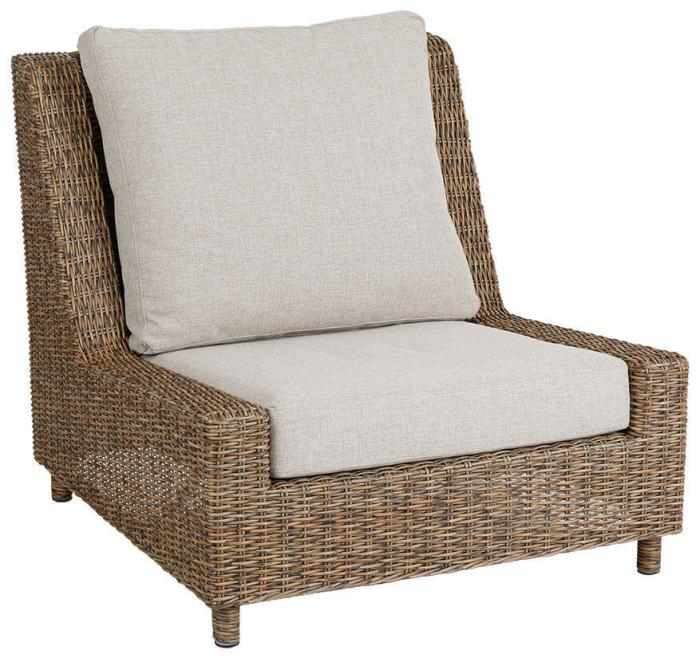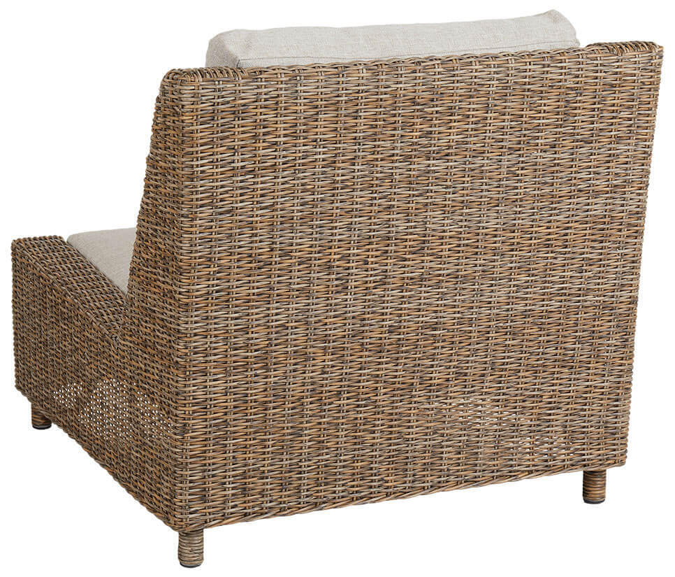 Sandkorn loungefåtölj är elegant och måttfull med inbjudande proportioner och en avslappnad New England-stil. Tillverkad i rustik konstrotting med tjocka och mjuka kuddar i sandfärgat olefintyg.
