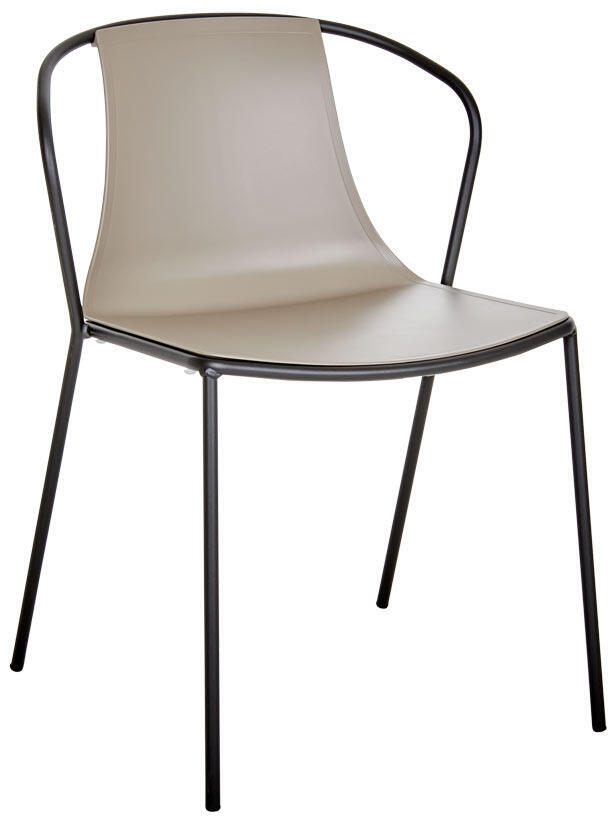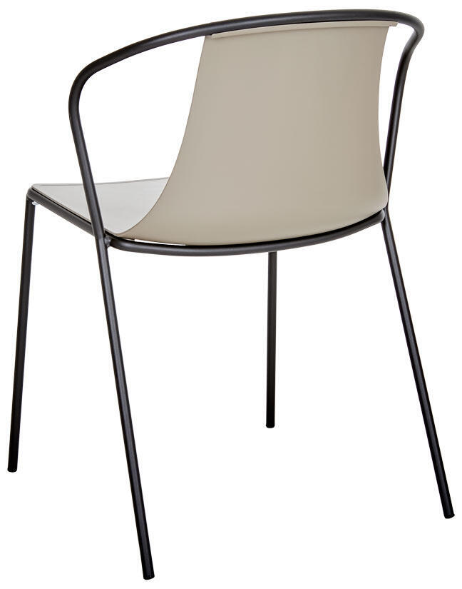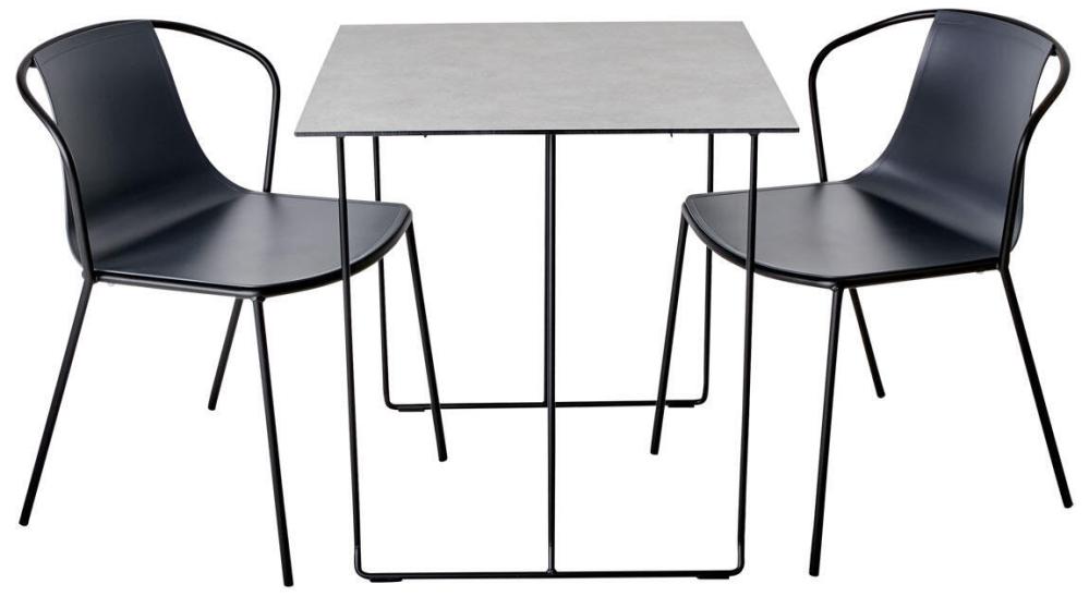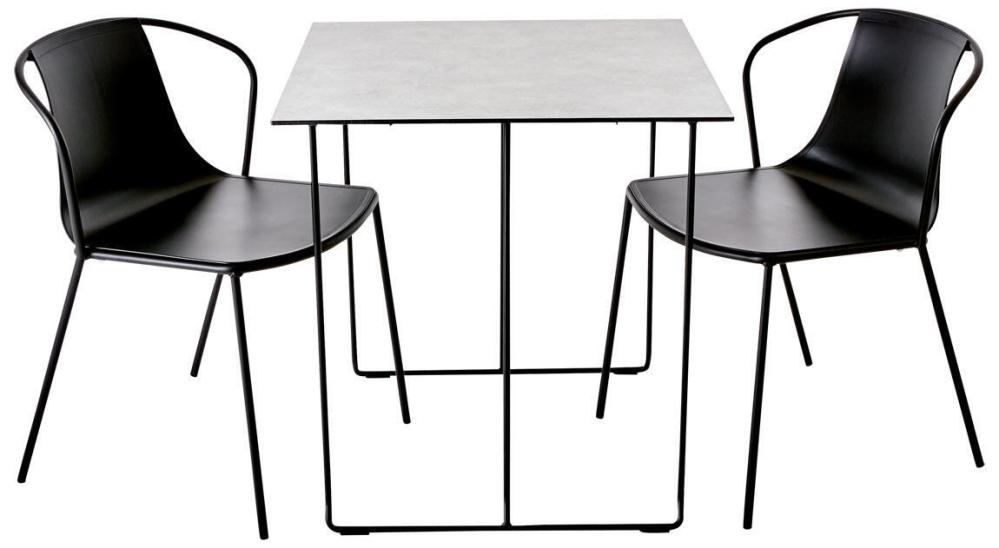 Här kompletteras bordet med två Kasia matstolar för att skapa en enhetlig och elegant utomhusmiljö. Kasia-stolens smala profil ger en sofistikerad touch samtidigt som dess metallstruktur säkerställer hållbarhet i alla väderförhållanden. Dess sits i teknopolymer förbättrar inte bara komforten utan gör också stolen lämplig för offentliga miljöer.