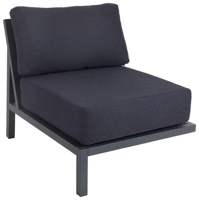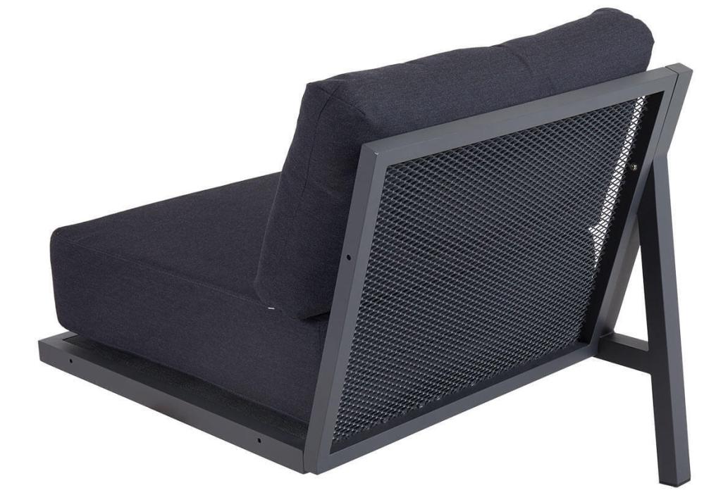 Delarna är tillverkad i en stomme i matt antracitgrå aluminium, mörkgrå textilene och korpsvarta tjocka och bekväma dynor i akryltyg.