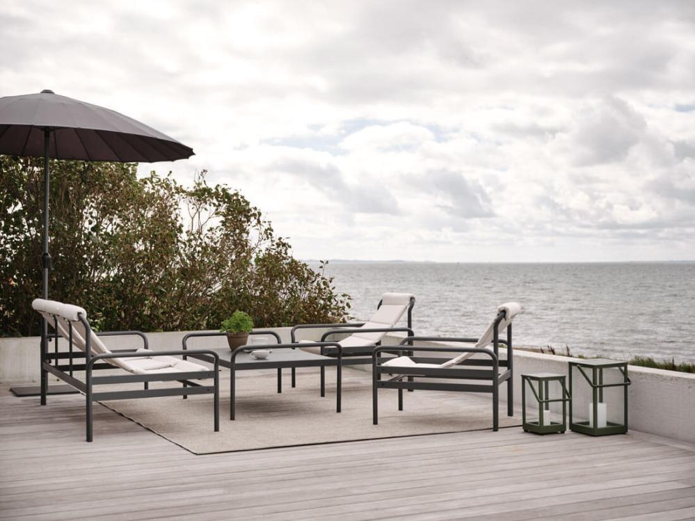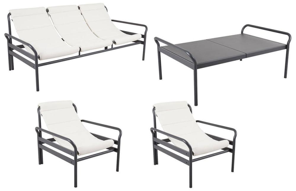 Serien innehåller fåtölj, soffa och soffbord. I aluminiumfärg antracit och nordic green samt tyg barley och vanilla white.