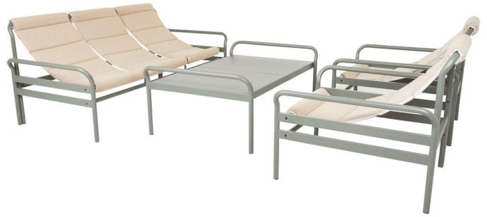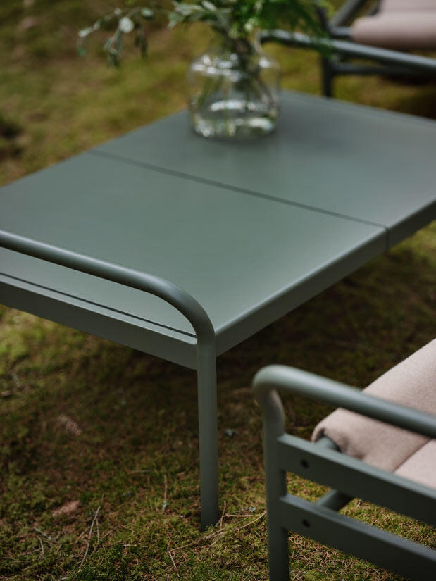 Sling soffgrupp med bord - med en stomme i nordic green aluminium sitter du tryggt i denna loungegrupp. De mjuka formerna märks även på armstöden och ryggen som elegant och bekvämt vinklas ut på toppen. Sittmöblerna kombineras både praktiskt och elegant med det generösa soffbordet (135x85 cm).