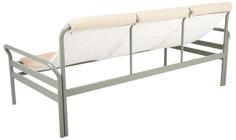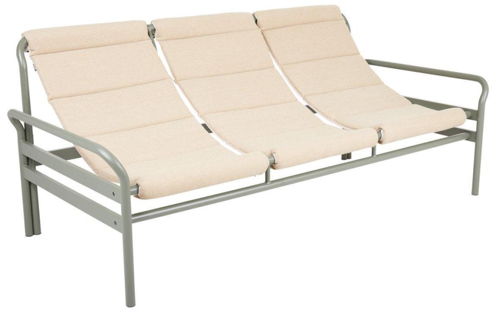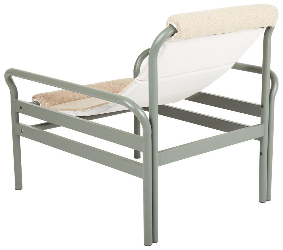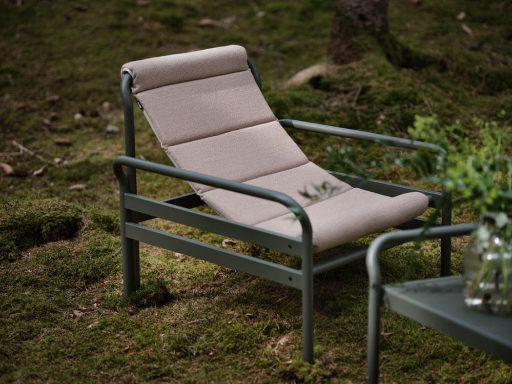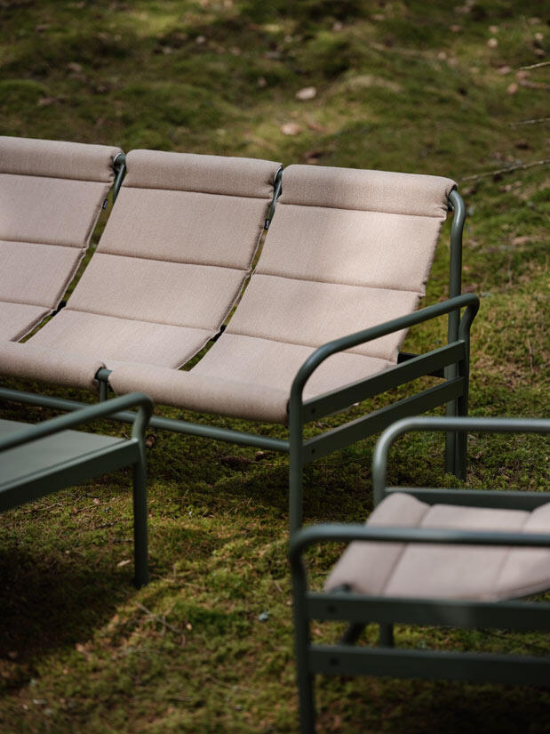 Serien innehåller fåtölj, soffa och soffbord. I aluminiumfärg antracit och nordic green samt tyg barley och vanilla white.