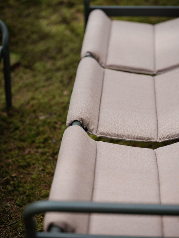 Sling-serien har formen som blir sommarens snackis. En mjuk, rund och böljande design som lekfullt fångar sommarens väsen. Dynornas hängande böj blir inte bara en stilig fortsättning av stommen – de är dessutom otroligt sköna att sitta i.