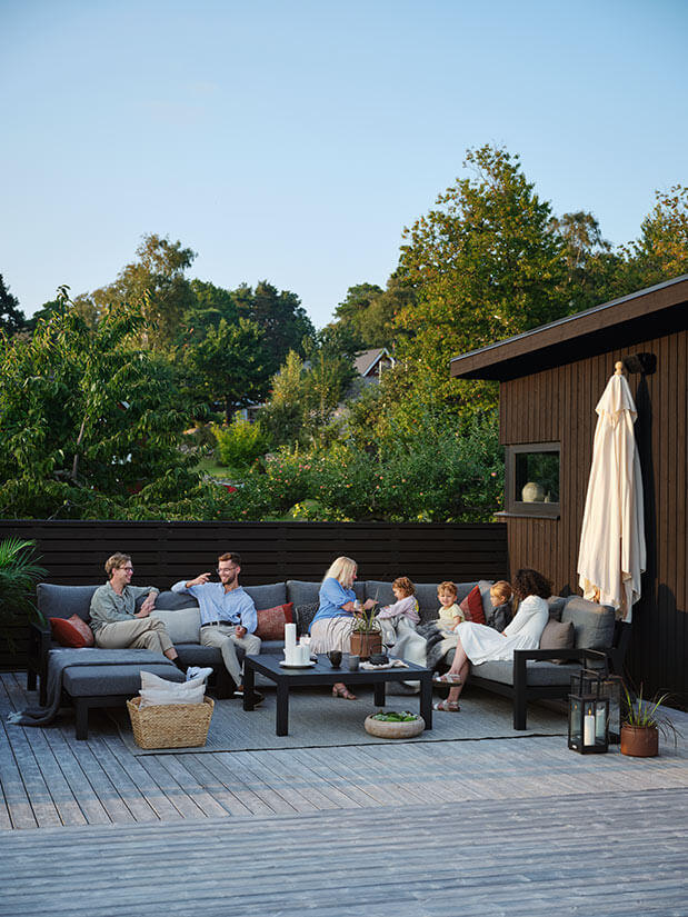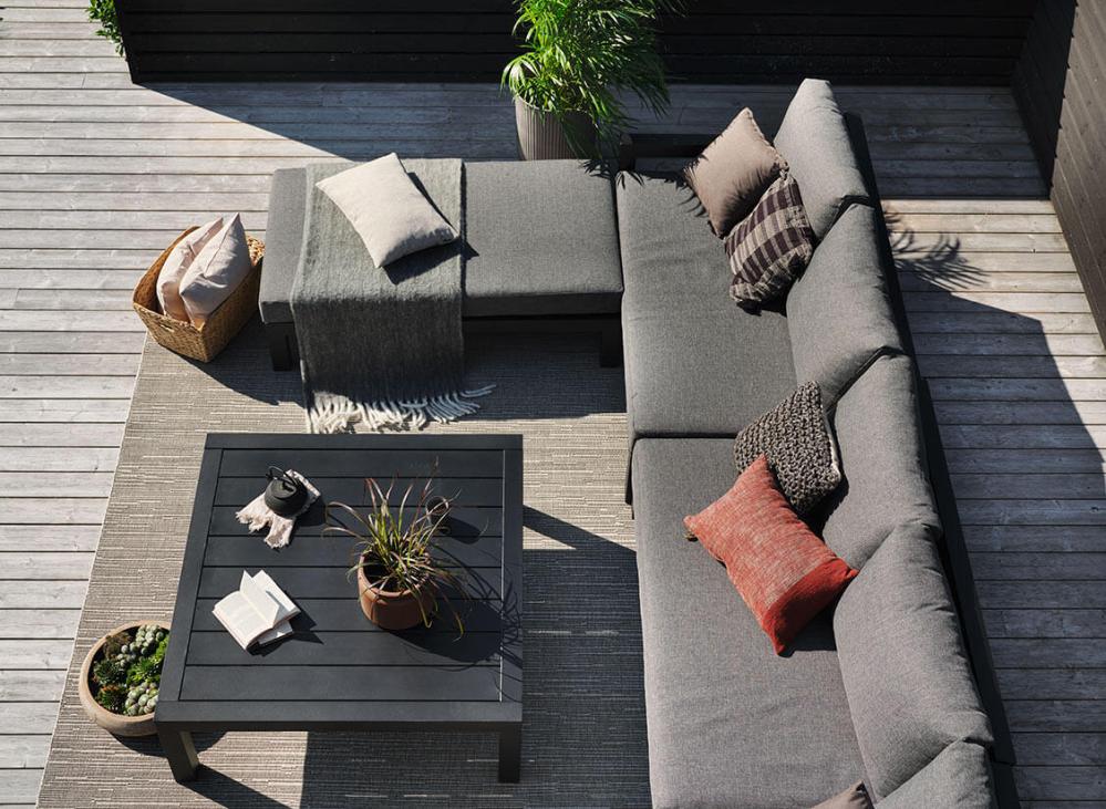 Vänner och familj får plats i en av Brafabs mest generösa aluminium-hörnsoffor. Stettler är en underbar utesoffa som både ger bredd och djup vilket inbjuder till skön relax för alla.