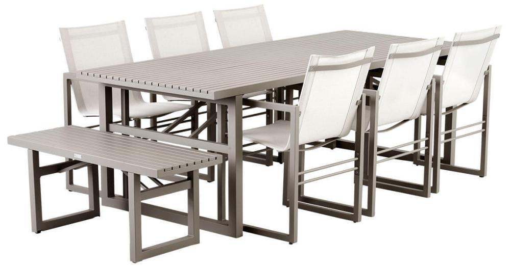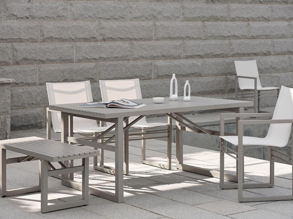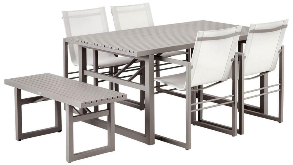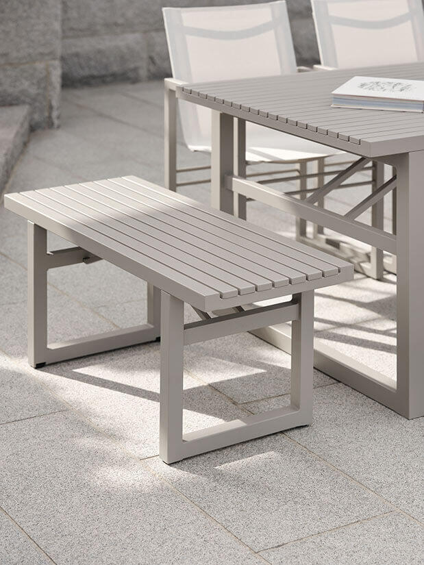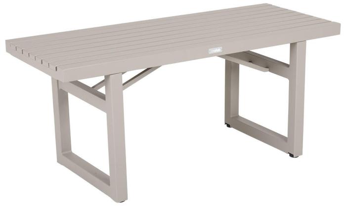 Vevi-familjens kanske mest mångsidiga medlem har du i denna bänk, som passar lika bra som extra sittplats vid bordet när ni blir många, som på en vilsam plats i trädgården. Kommer i fyra olika färger, varav det senaste tillskottet är en modern nyans i khaki, som passar mycket bra till sommarens grönska. Den här modellen i aluminium mäter 105x41 cm, finns även i bredare längd.