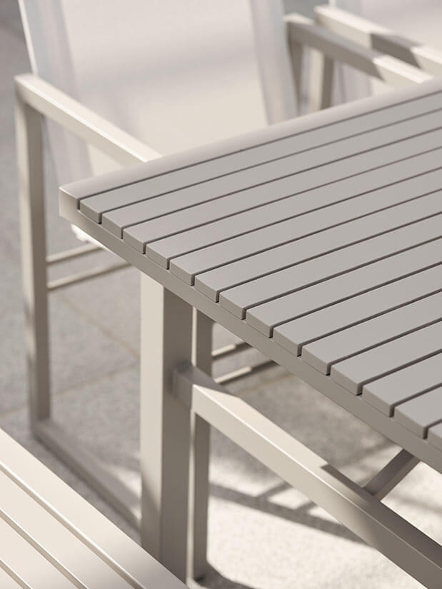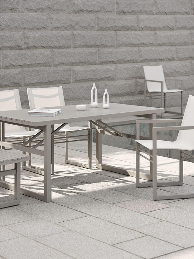 Nordiskt formspråk, rena linjer och en flört med såväl kubism som ett grafiskt uttryck kännetecknar Vevi produktserie, som blivit en riktig Brafab-klassiker. Från det generösa matbordet med plats för familj och vänner, till bekväma stolar, sidobord, loungefåtöljer och mycket mer av det som gör din uteplats till det perfekta stället för avkoppling och umgänge. Många av enheterna kommer i flera olika utföranden, och kombinerar textil med såväl teak och rostfritt stål som aluminium i olika kulörer. Design Dick Björk.