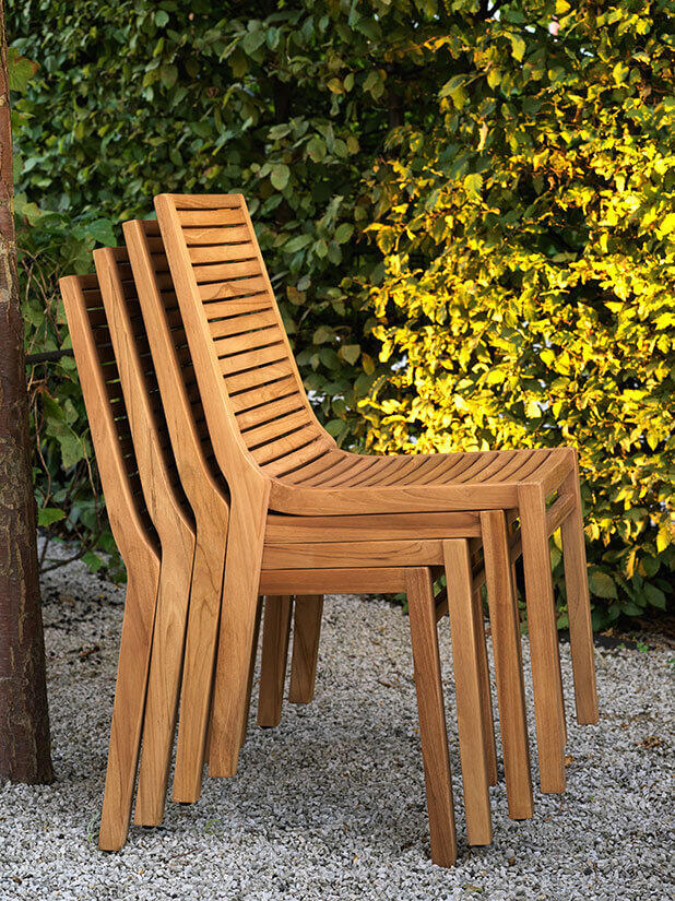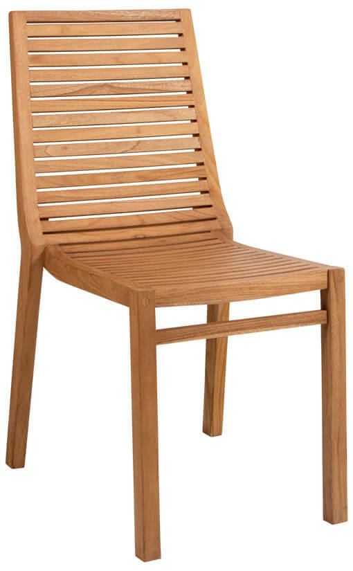 Volos matstol / stapelstol är en klassiskt formad stol i teak. Dess eleganta formspråk med horisontella teakribbor i rygg och sits har ett litet avstånd emellan vilket bidrar till dess stilrena look och sköna komfort. Tanken med Volos är att du inte ska behöva använda dynor, men såklart kan även dessa teakmöbler kompletteras med dynor som passar din stil och uteplats.