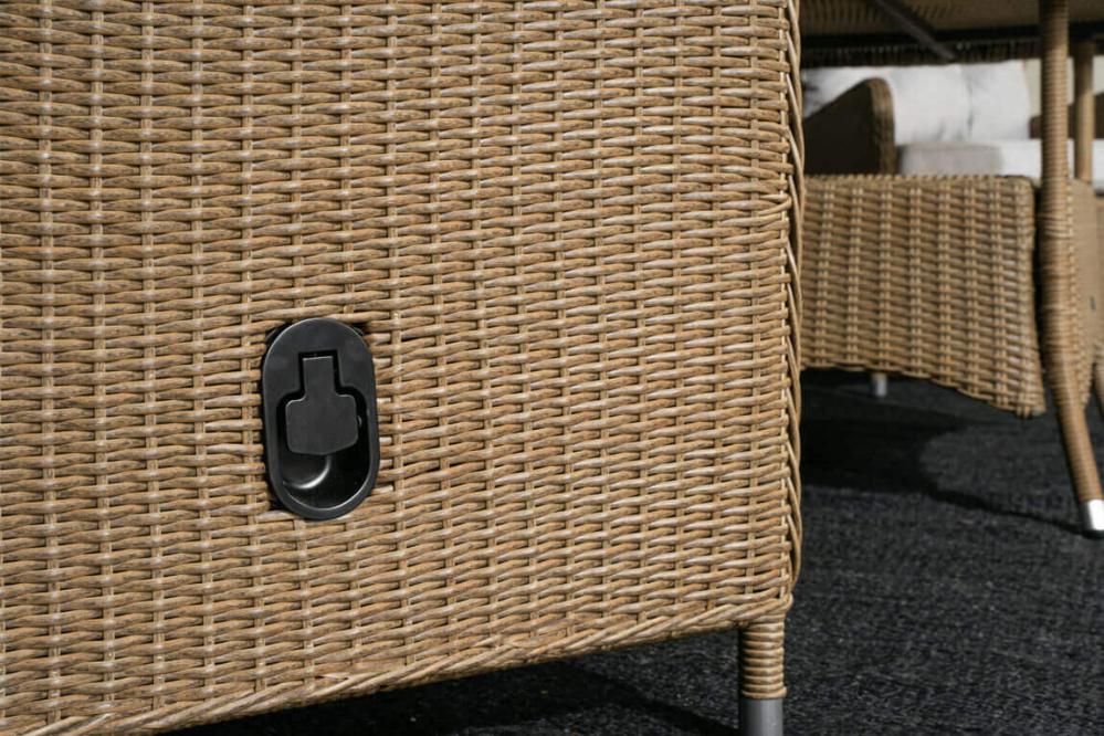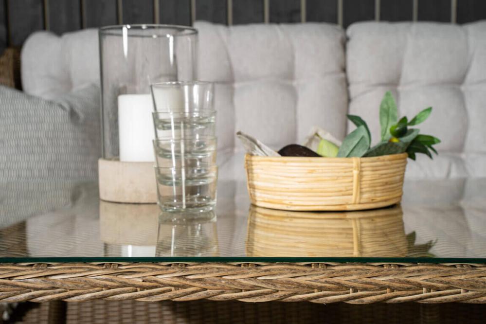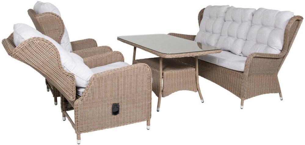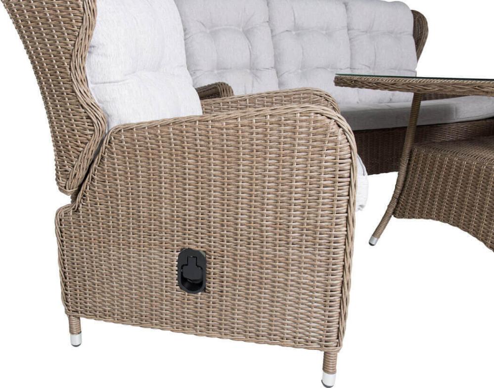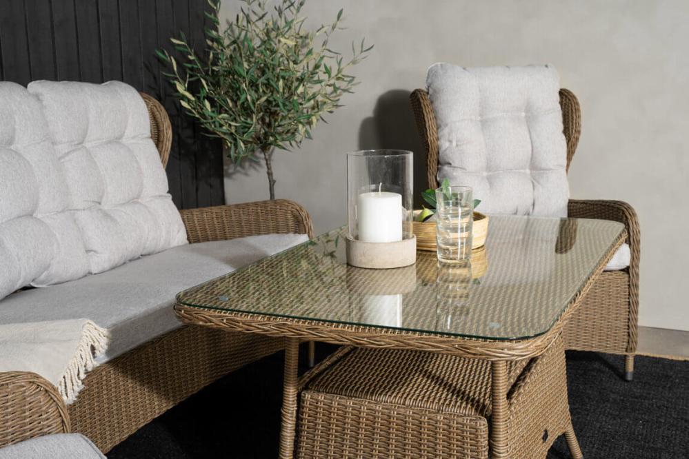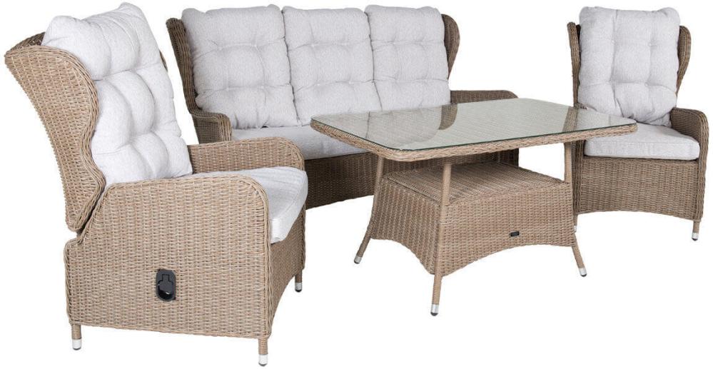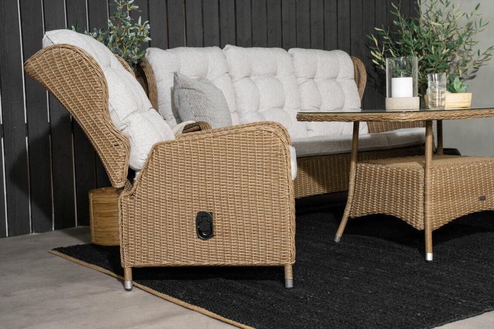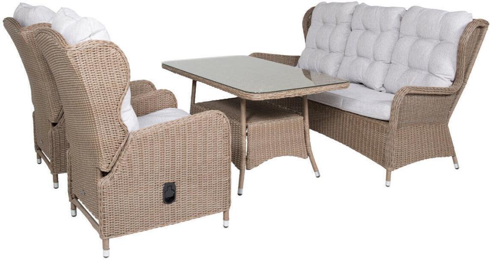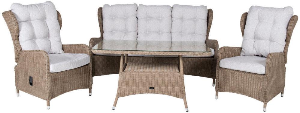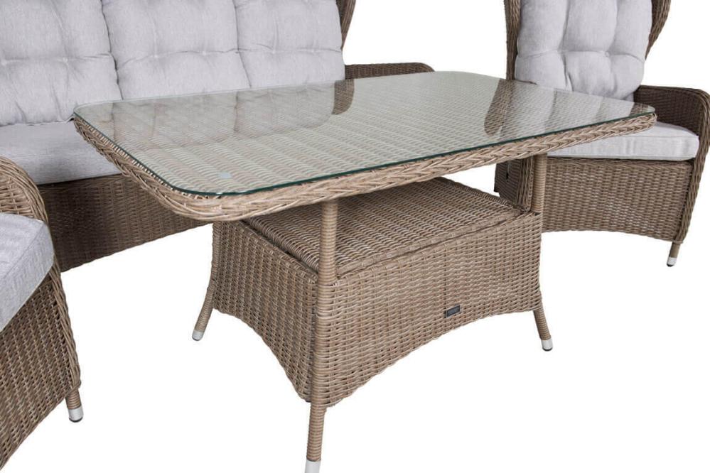 Washington är en pampig grupp med sköna former inspirerad av en klassisk mormorsfåtölj. I gruppen ingår en 3-sits soffa, 2 stycken ställbara öronlappsfåtöljer och ett bord 125x75 cm med glasskiva. Natur konstrotting inkl beige dynor.