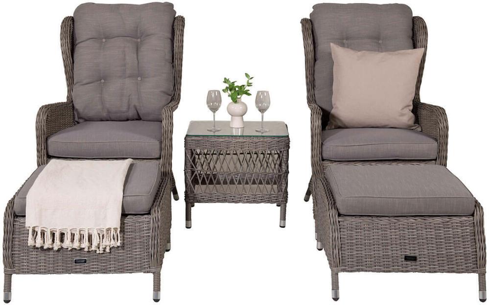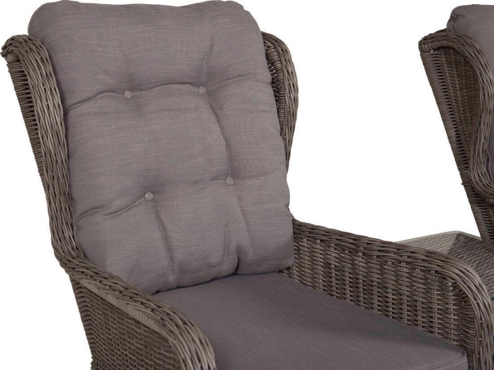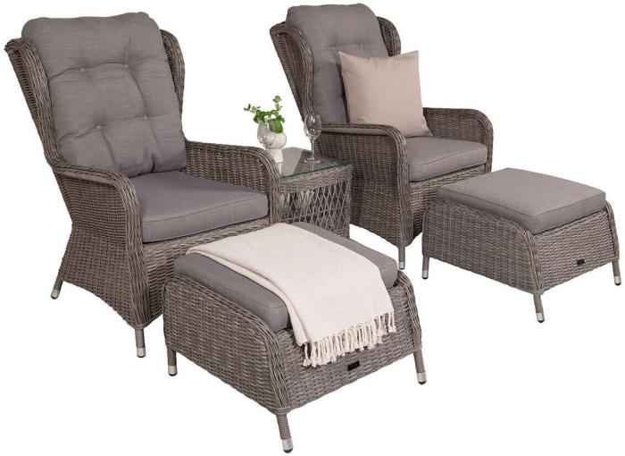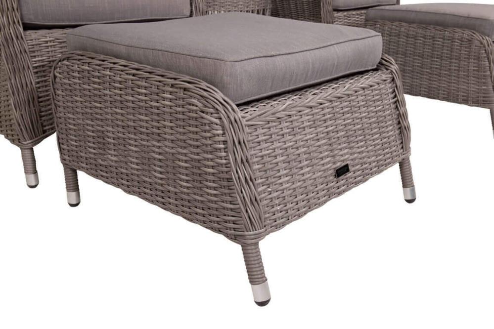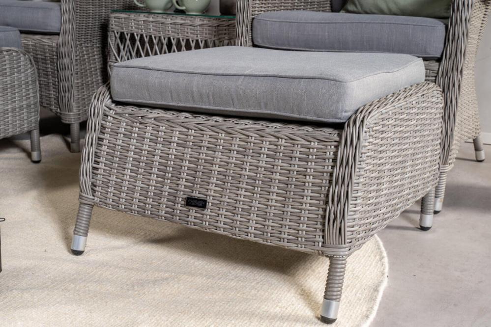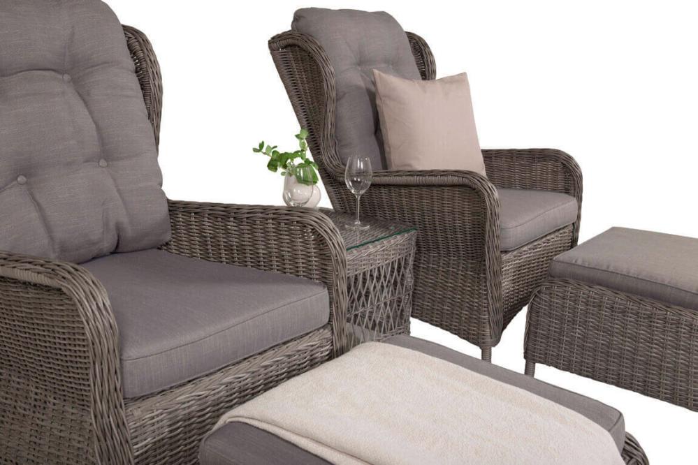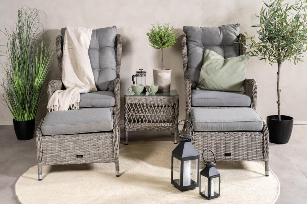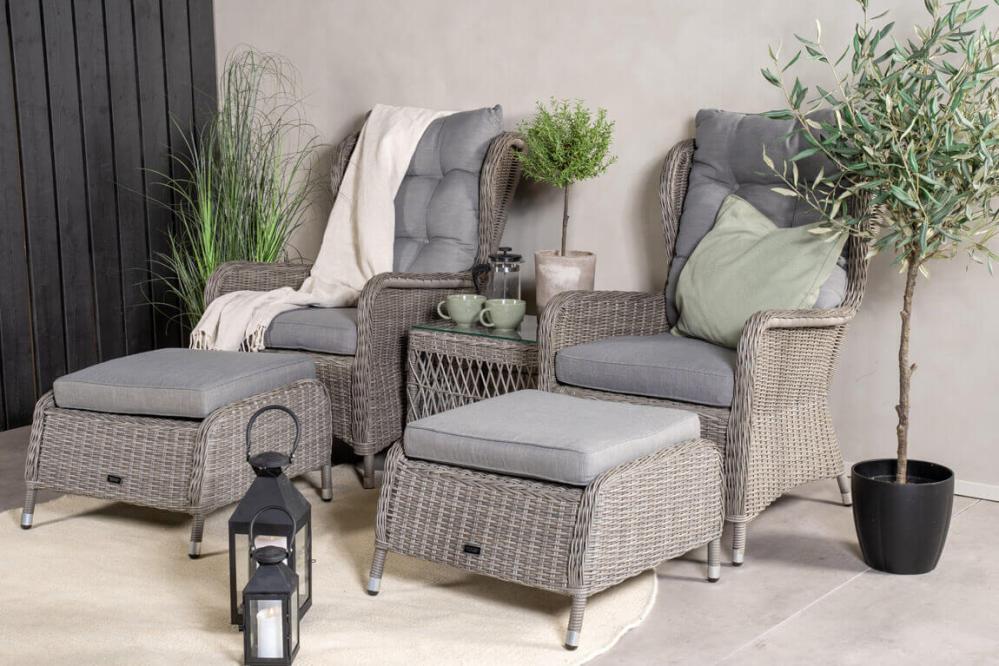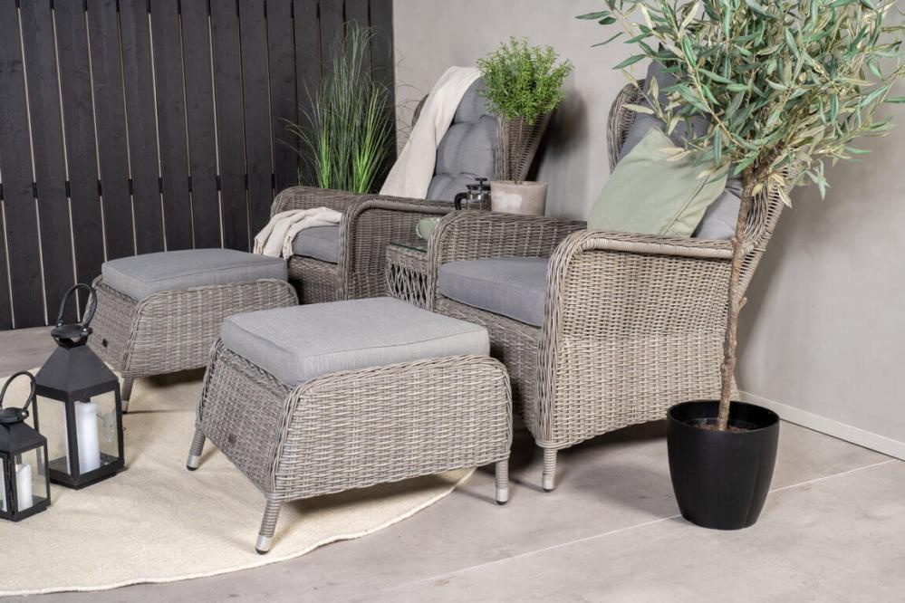 Washington är ett komplett loungeset med två öronlappsfåtöljer, två fotpallar, bord och dynor. Natur konstrotting på aluminiumstomme med beige dynor.