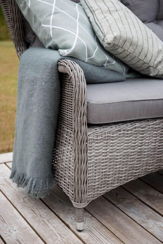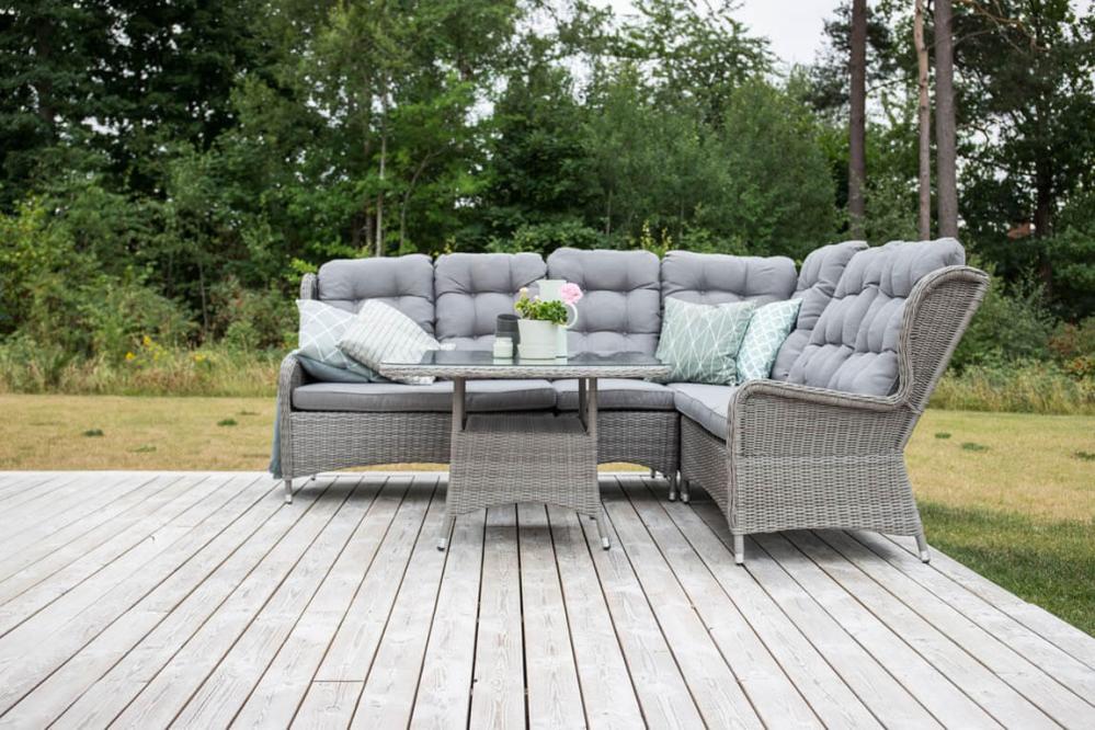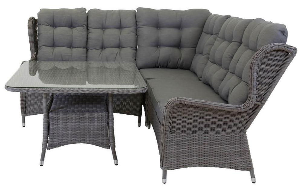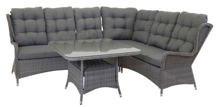 Washington är en pampig hörnsoffa med sköna former inspirerad av en klassisk mormorsfåtölj. Grå hörnsoffa inkl. grå dynor och bord 100x100 cm med glasskiva. Soffan är vändbar.