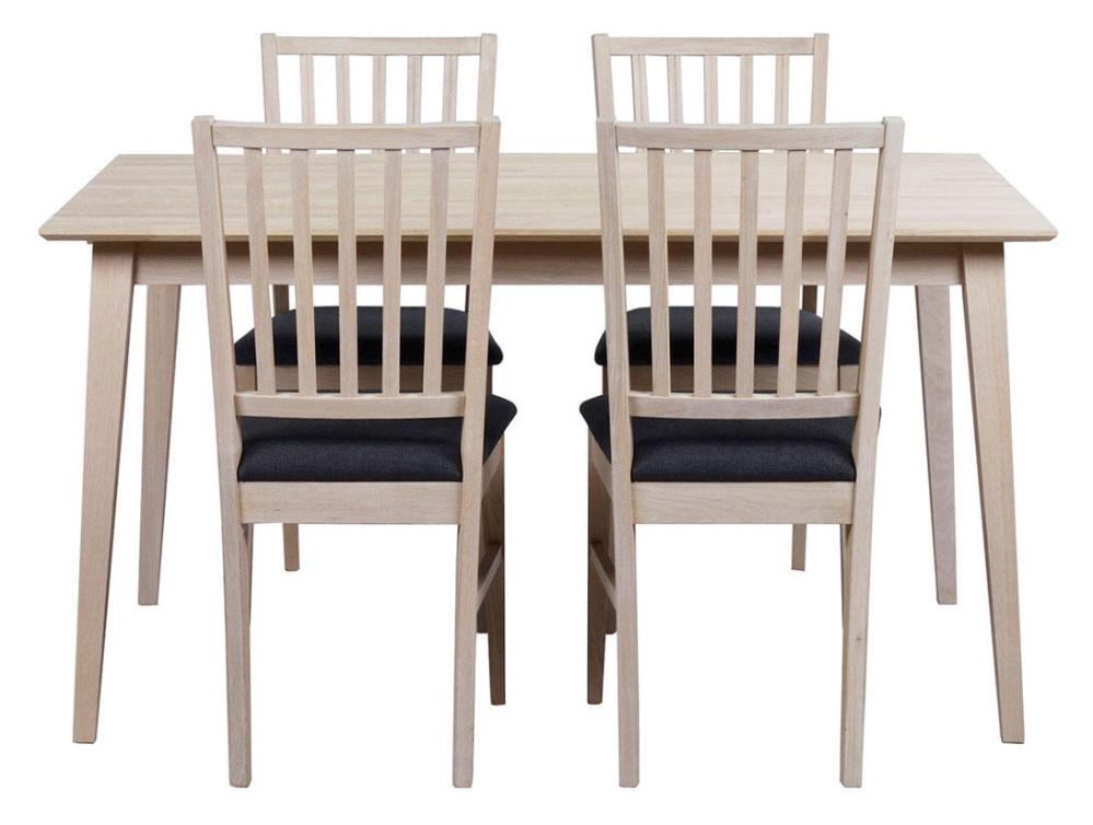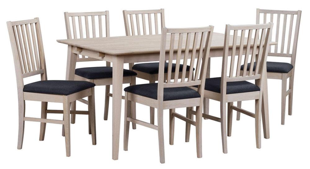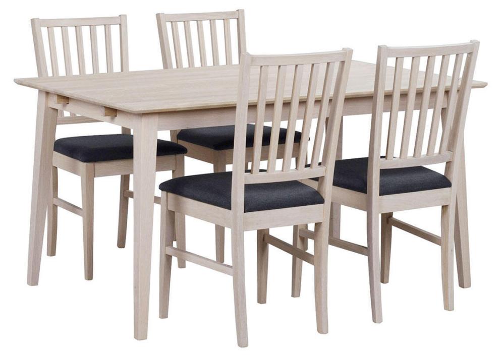 Filippa är ett tidlöst matbord i storlek 140x90 cm i oljad och vitpigmenterad ek. Kan kompletteras enkelt med upp till två tilläggsskivor för att få plats för fler. Tillsammans med bordet ingår fyra stycken trästolar Filippa i tidlös och skandinavisk design. Stolen är i vitpigmenterad ek med dekorativ stoppad sits med grått tyg. Stolen levereras monterad. Matgruppen ingår i serien Filippa, i serien finns fler storlekar av matbord, stolar och förvaringsskåp.
