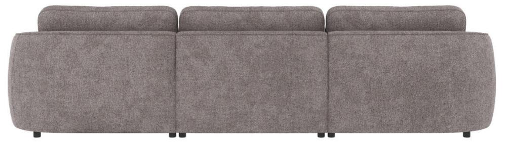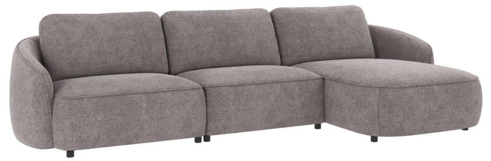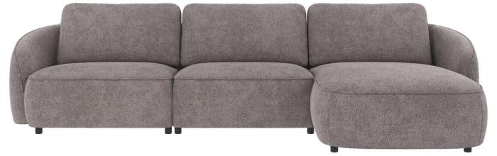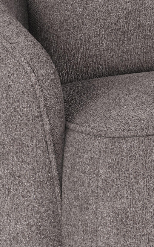 Norris 4-sitssoffa med divan höger, här klädd i tyget Greg grå (#18), är en soffa med runda, organiska former som skapar en harmonisk känsla i hemmet. Ryggkuddarna är lösa och skapar extra komfort, de går att placera tätt ihop eller med ett litet mellanrum. Sittdynan är fast och innehåller nozag-fjädrar för att skapa en skön sittyta.