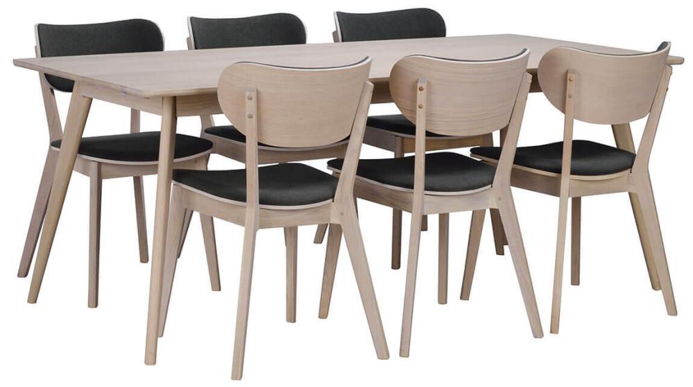 Yumi matbord i skandinavisk design med lätt utställda ben och sex stycken bekväma stolar. Bordsskivan är i högkvalitativ vitpigmenterad ekfanér och ben och sarg i massiv ek. Kan kompletteras med upp till två tilläggsskivor. Maxlängd 280 cm.