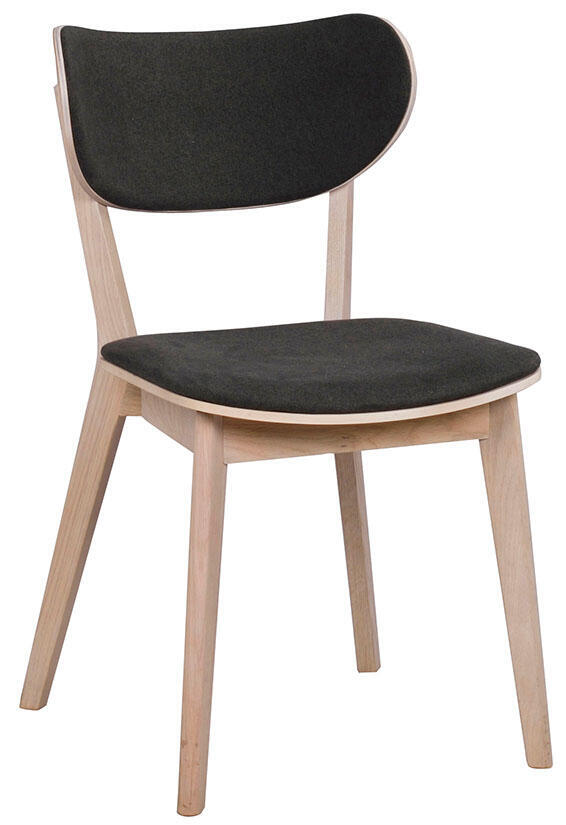 Stol: Massiv ek i ben och stomme. Böjd plywood i sits och ryggbricka, klädd med polyeter och 100% polyester tyg