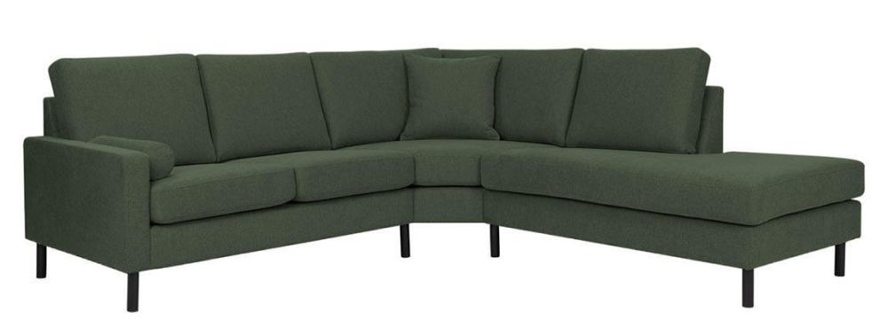 Denna modell: Arm (J5) + 2-sits (O) + 90 grader hörn (D2) + Relaxdel avslut (F1). På produktbilderna visas tyg Wind Green 06 med runda metallben i svart F76. En rullkudde (pöl) och decokudde ingår i priset